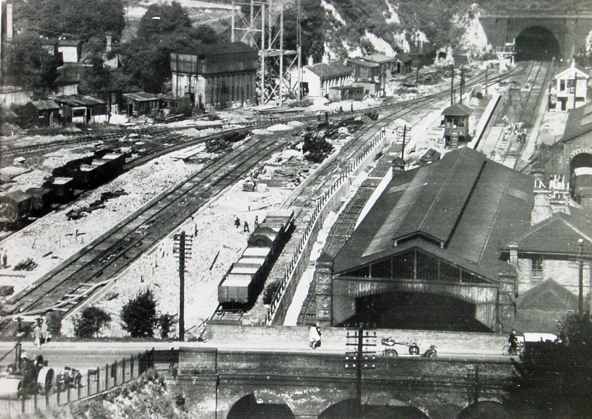 Due to repeated landslips on the line between Folkestone and Dover, Southern successfully applied to Parliament, in 1934, to build a 4-mile loop from the main line at Folkestone to 557-yards east of Abbots Cliff tunnel but was never laid. October 1934 saw the Southern Railway Marine Department Divisional Offices move from Admiralty House, on Marine Parade, to a suite of offices in what remained of the old Town Station. The station was finally demolished in February 1963.