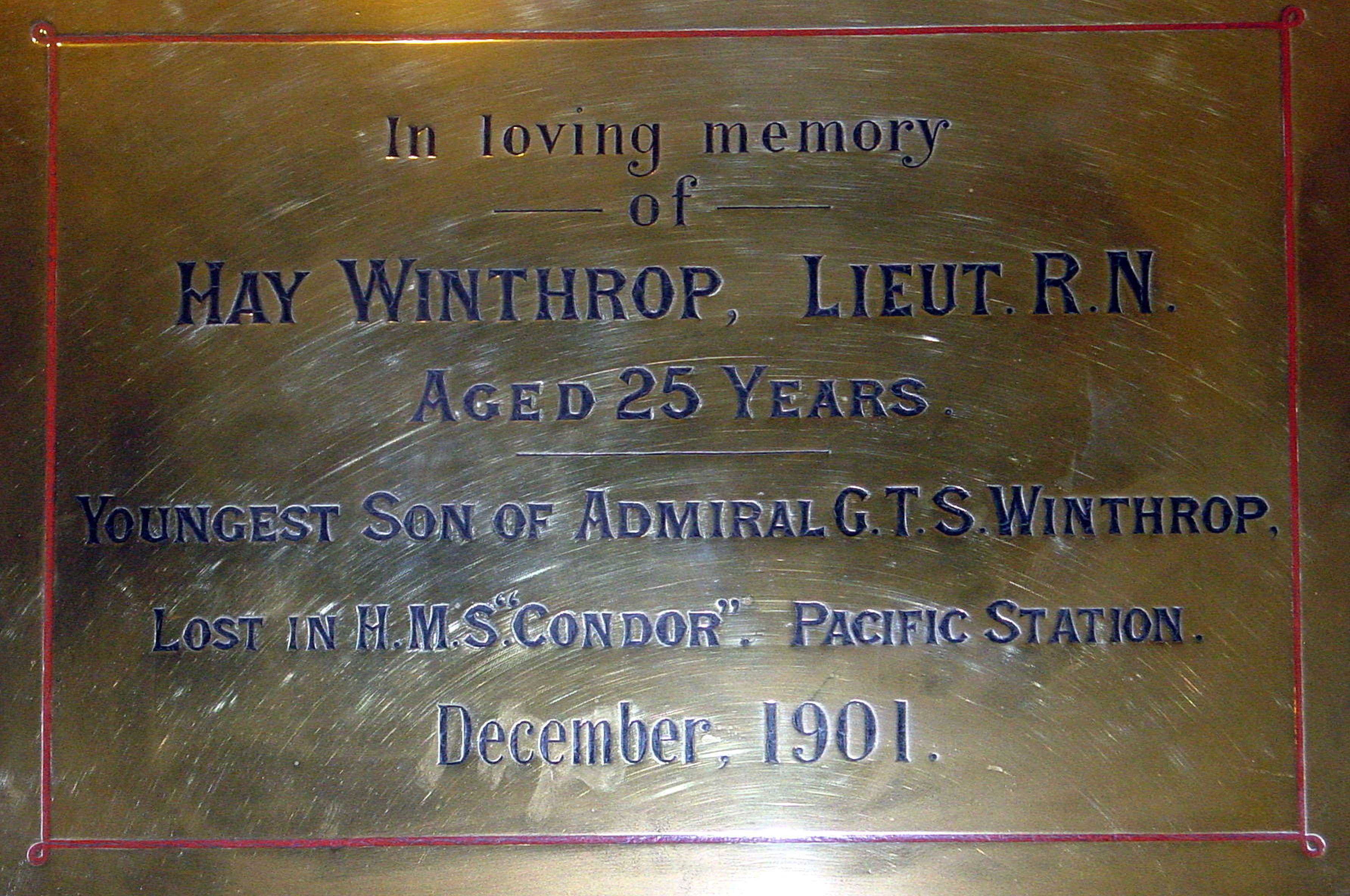 Whether Admiral George Winthrop was particularly close to his brother Hay is not clear, but he called one of his sons by that name. Hay was born in 1876 and when he grew up joined the Royal Navy too. As a lieutenant, Hay was assigned to the Condor a sail/single screw steel 980-ton sloop, built at Sheerness and launched 17 December 1898. One can guess that Hay was please when he joined the Condor on her first commission.