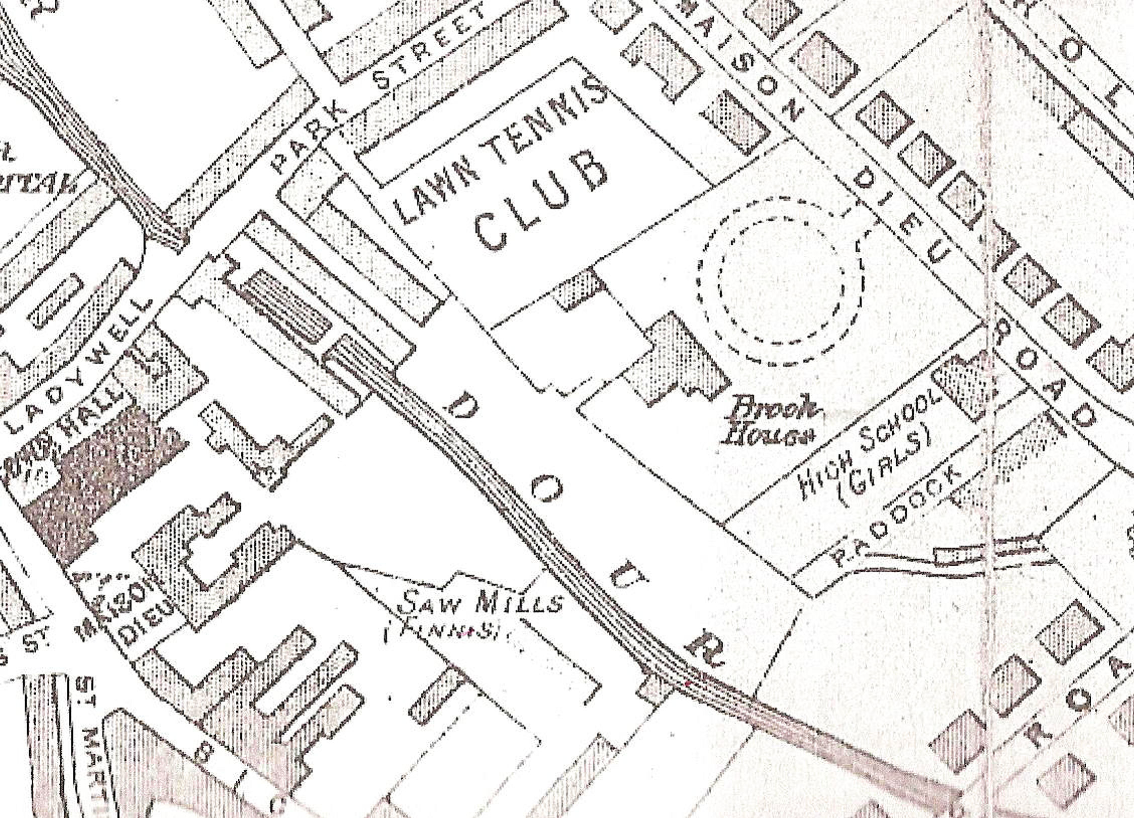 Brook House & Finnis Saw Mill 1890. The Electricity Station was built on the site of the Lawn Tennis Club, Park Street