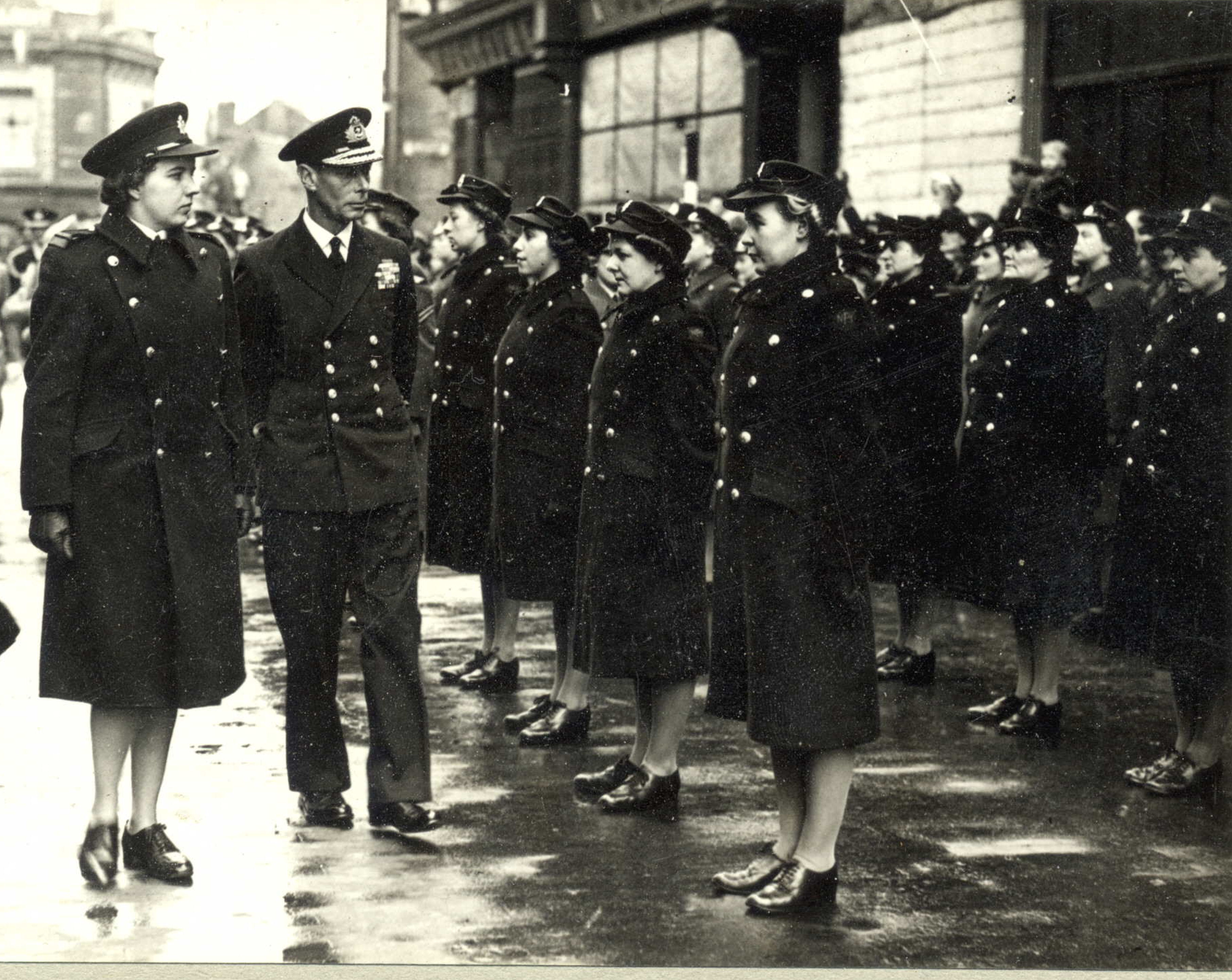 On 15 February 1944, a ‘Fire Guard’ plan was put into force in the town, requiring both men and women to undertake compulsory duties in what was considered the danger areas in Dover. A number of women protested and in June the Regional Commissioner agreed to relaxation but many of the women continued to undertake ‘dangerous areas’ duty voluntary. Once the bombardment of Dover from across the Channel ceased, on Tuesday 26 September 1944, the number of volunteer fire personnel was reduced, temporary stations closed and Fire Guard duties ceased. In October 1944, King George VI and Queen Elizabeth visited the town and escorted by Assistant Group Fire Officer Elizabeth Favell, inspected the Dover Firewomen.
