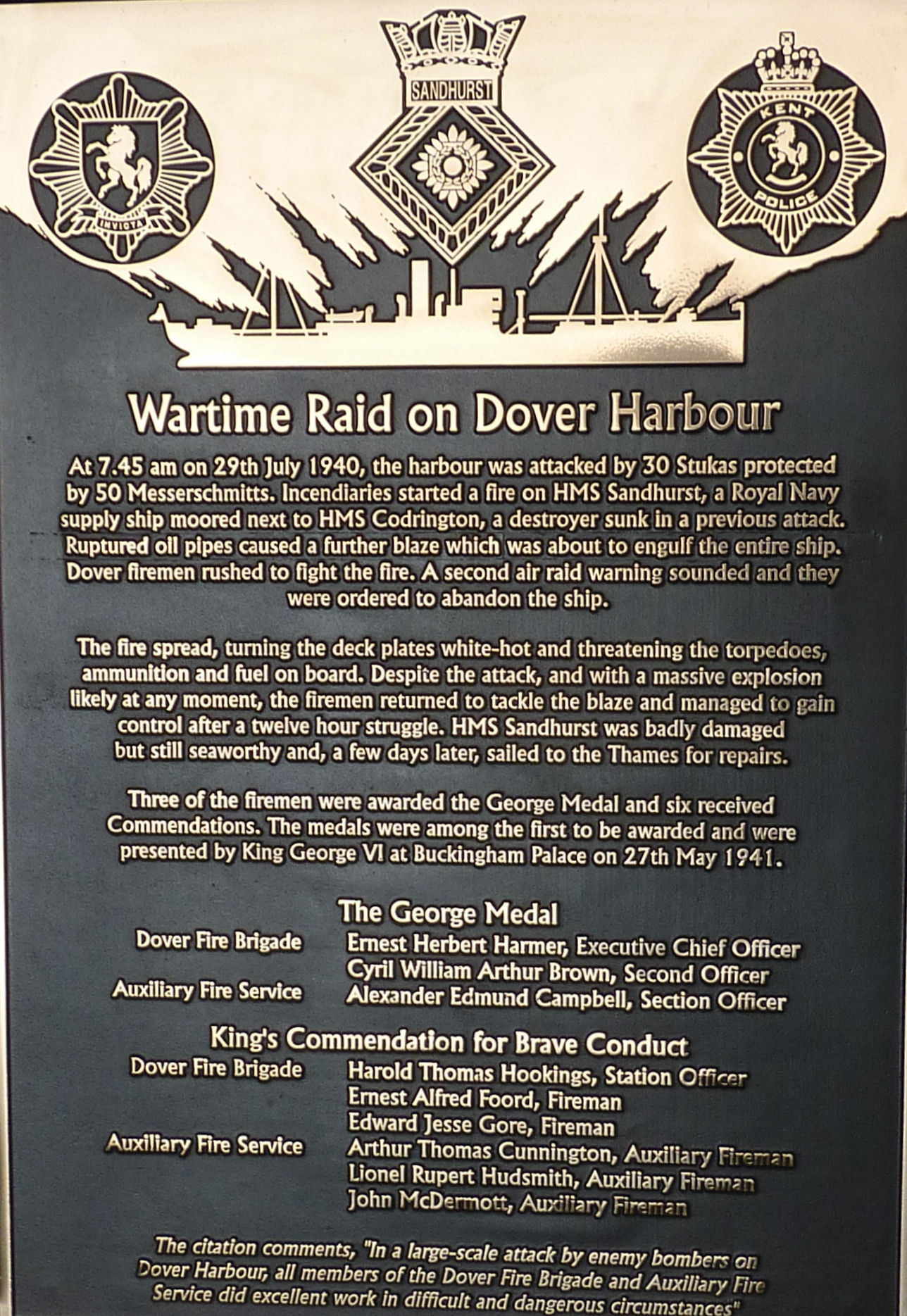 Finally, on 12 May 2013, a bronze plaque was unveiled, between the watchroom and first engine bay, at Dover Fire Station. This was in honour of the nine men who fought the Sandhurst, Codrington, Gulzar, Oil Installations and the other fires that occurred following enemy attack on the Eastern Dockyard in July 1940. Those who attended included six of the nine men whose names appear on the plaque. A black and white aluminium version of the plaque was presented the following day to Dover Harbour Board and is on display on the wall of the food outlet building near berths 8-9, Eastern Docks.