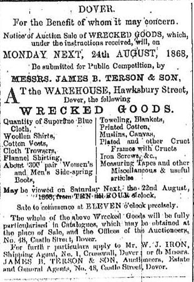 The problem of wreckers though, did not go away. In 1843, at Maidstone Winter Assizes Thomas Ladd age 38, John Kingsmill 40, John Norris 33, Richard Marsh 34, Richard Collard 28, John Godden 23, William Fagg 49, John Castle 28, George Marsh 40, all labourers, were accused of ‘Making a signal for the purpose of giving notice to some persons on board a smuggling boat, at St Margaret’s at Cliffe.’ They were all found guilty and imprisoned for six months with hard labour.