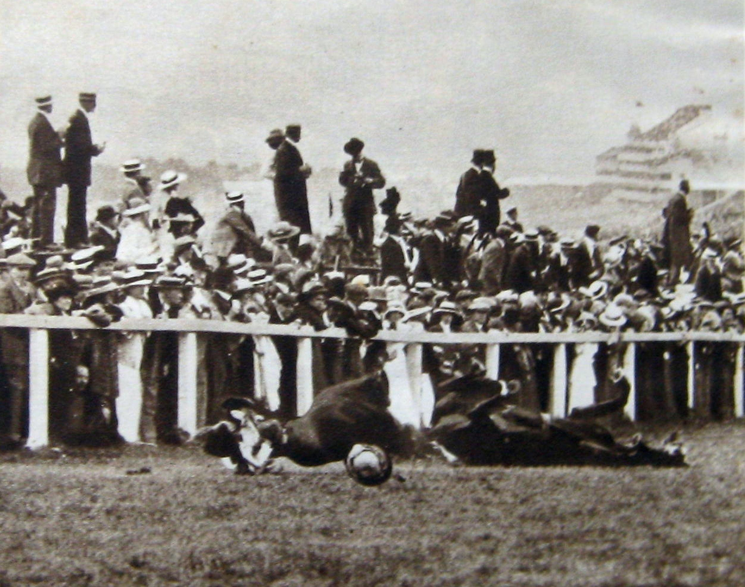 On 4 June 1913 Emily Wilding Davison, trying to pin a WSPU flag on the King’s horse, Anmer, at the Epsom Derby, fell underneath its hoofs. The establishment were outraged, with the Times giving lengthy coverage on the state of the horse and the jockey. The horse was unharmed and the jockey’s injuries consisted of slight concussion, cuts and bruises and an injury to his arm.