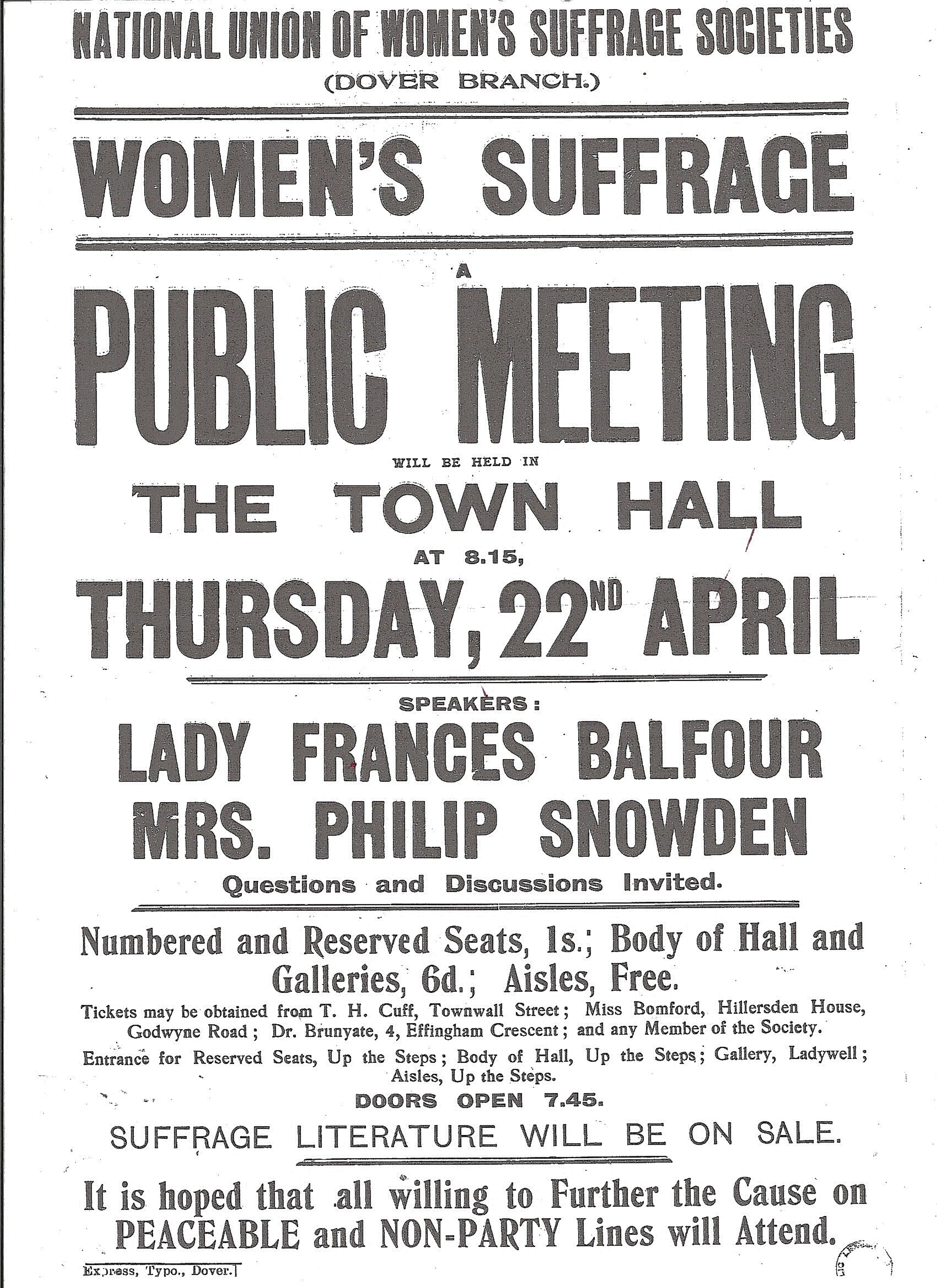 Public meetings were held and on 6 December 1876, 400 people, mainly women, attended a packed Wellington Hall, (between Snargate and Northampton Streets), to hear speeches from leading suffragists, Helen Blackburn, Isabella Tod, Caroline Biggs and Mary Anne Apps of Dover Suffrage Society