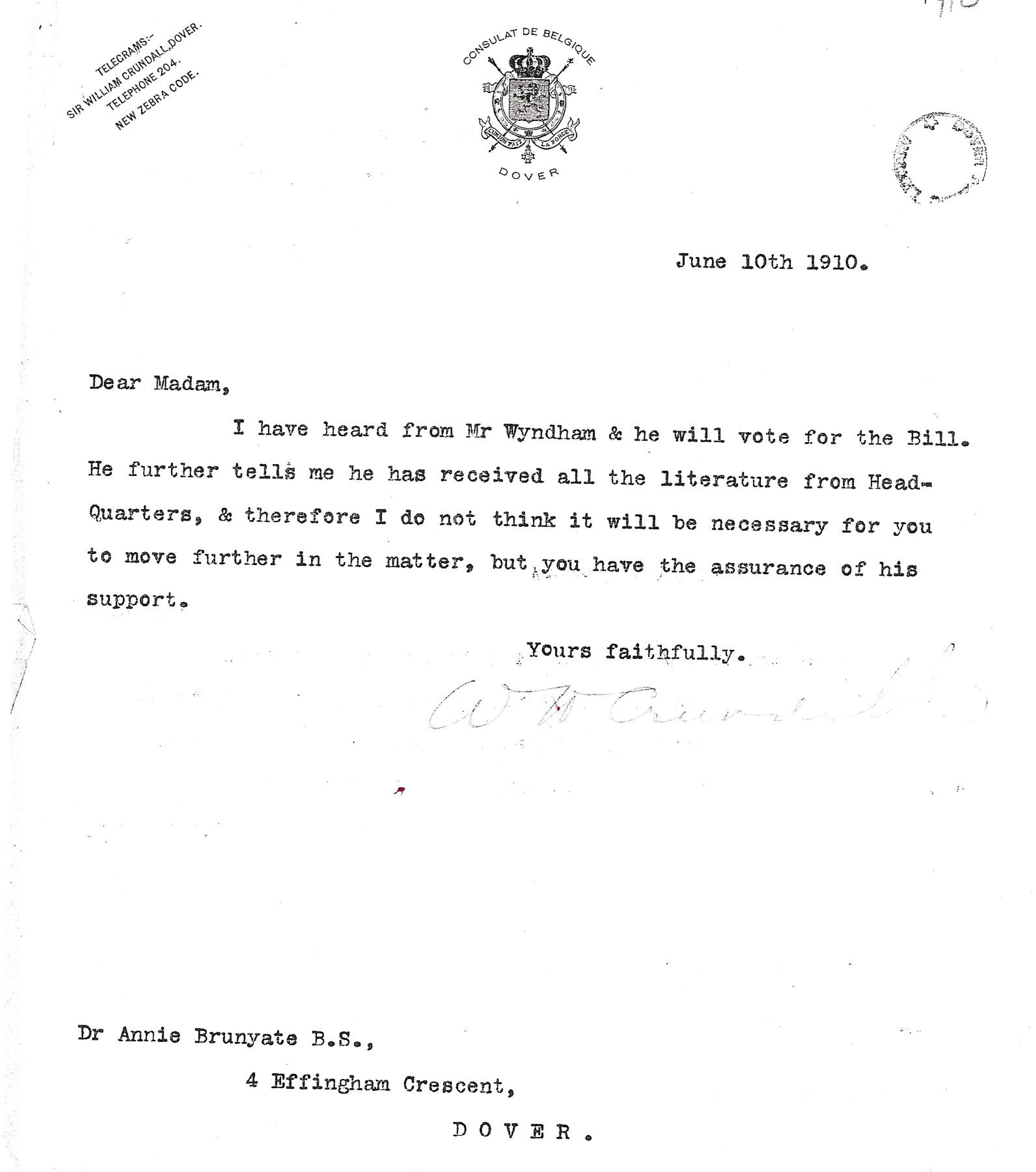 In the meantime, on 10 June, William Crundall, Mayor of Dover, wrote to Annie Brunyate saying that Dover’s MP, George Wyndham would be voting for the Bill supporting Women suffrage. This was the Parliamentary Franchise (Women) Bill, better known as the first Conciliation Bill, and if enacted it would enfranchise women on the same terms as men. The Bill was given a Second Reading on 12 July and by the large majority of 299 to 190 was sent for consideration to Committee. To keep up the momentum going the next major demonstration was scheduled for 23 July.