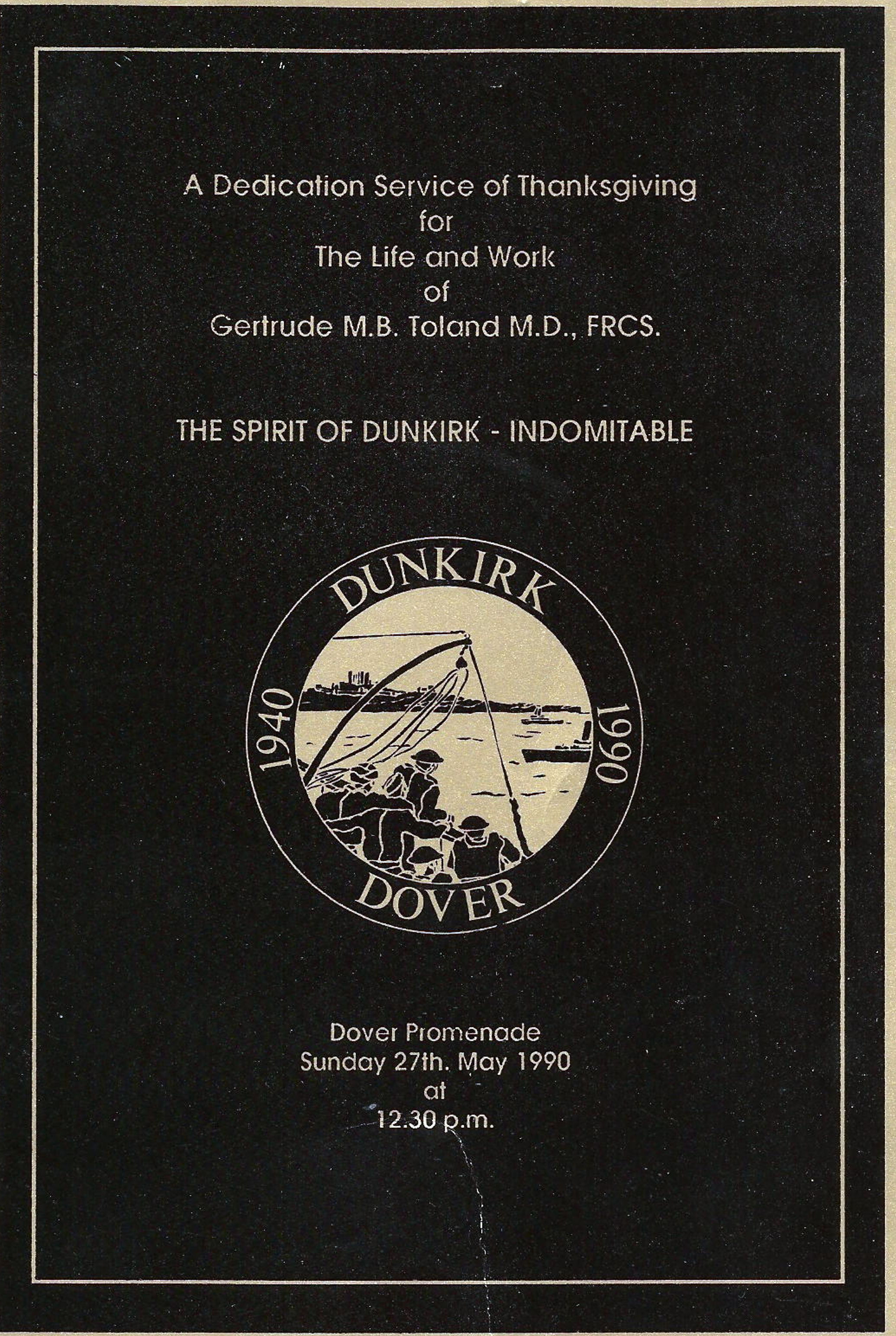 In 1989, Councillor Arthur Husk and Mary Hutchinson launched a fund to provide the Seat, mentioned at the beginning, in her memory on the Seafront for the 50th anniversary of Dunkirk. This was unveiled by the then Mayor, Cllr. Bill Newman, on 27 May 1990. The dedication reads, ‘… to Dr Gertrude Toland in recognition of her outstanding medical services rendered to the people of Dover, especially during the evacuation of Dunkirk when she operated day and night at Buckland Hospital on the many casualties rescued from the beaches of Dunkirk.’