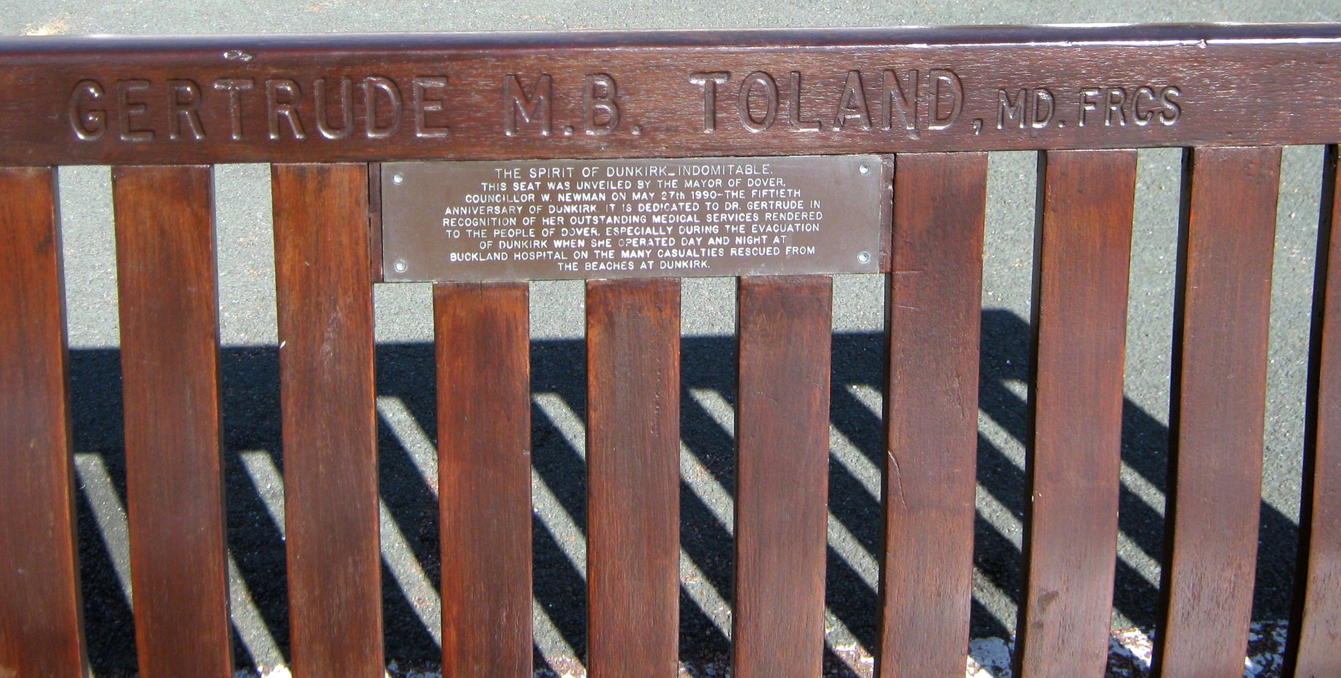 On Dover’s Seafront is a seat dedicated to Dr. Gertrude Toland, there is also a plaque to her memory at Buckland Hospital. These are both in commemoration of her tireless work during the evacuation of Dunkirk, which although generally known was not acknowledged until these tokens of appreciation were erected.