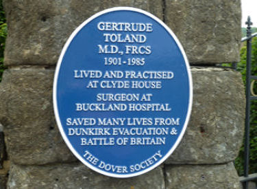 On 13 April 2018 members of Dr Gertrude Toland family attended a ceremony when the Dover Society unveiled a blue plaque on the gatepost of Clyde House, in Maison Dieu Road, where she practised as a GP following World War II. The plaque honoured Dr Toland’s work during World War II and her son, Gordon Toland, told the many who attended that among his mother’s possessions was a bullet she extracted from a German pilot’s bottom! Dr Gertrude Toland never discriminated.