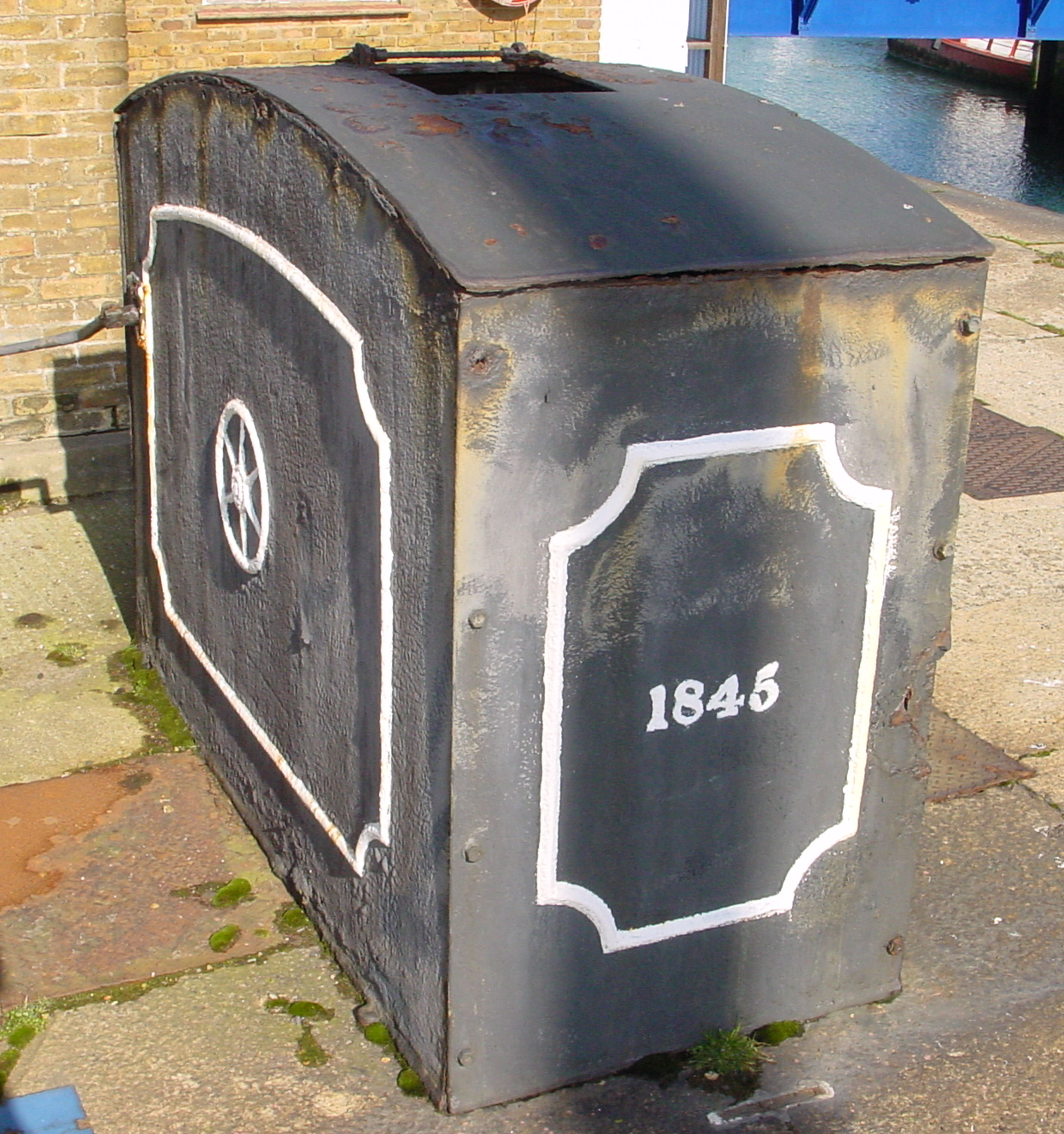 The Great Pent was then lined with granite and two 60-feet (18.3 metres) giant lock gates were inserted that provided access and egress between the Great Pent and the Tidal harbour. Over these, an iron bridge was built and the whole enterprise was completed in 1844 and cost about £45,000. The Lord Warden, the Duke of Wellington (1769-1852), opened what was formerly the Great Pent along with the bridge on the 13 November 1846. They were named, respectively, Wellington Dock and Wellington Bridge but known, until recent times, under its old name of the Pent or the Inner Harbour. The winch mechanism, installed in 1845, to operate the lock gates can still be seen. Before the works had been completed, an Ordnance Store was built in 1841 on Cambridge Road with a wharf alongside the new dock. This is now part of the De Bradelie Wharf complex.