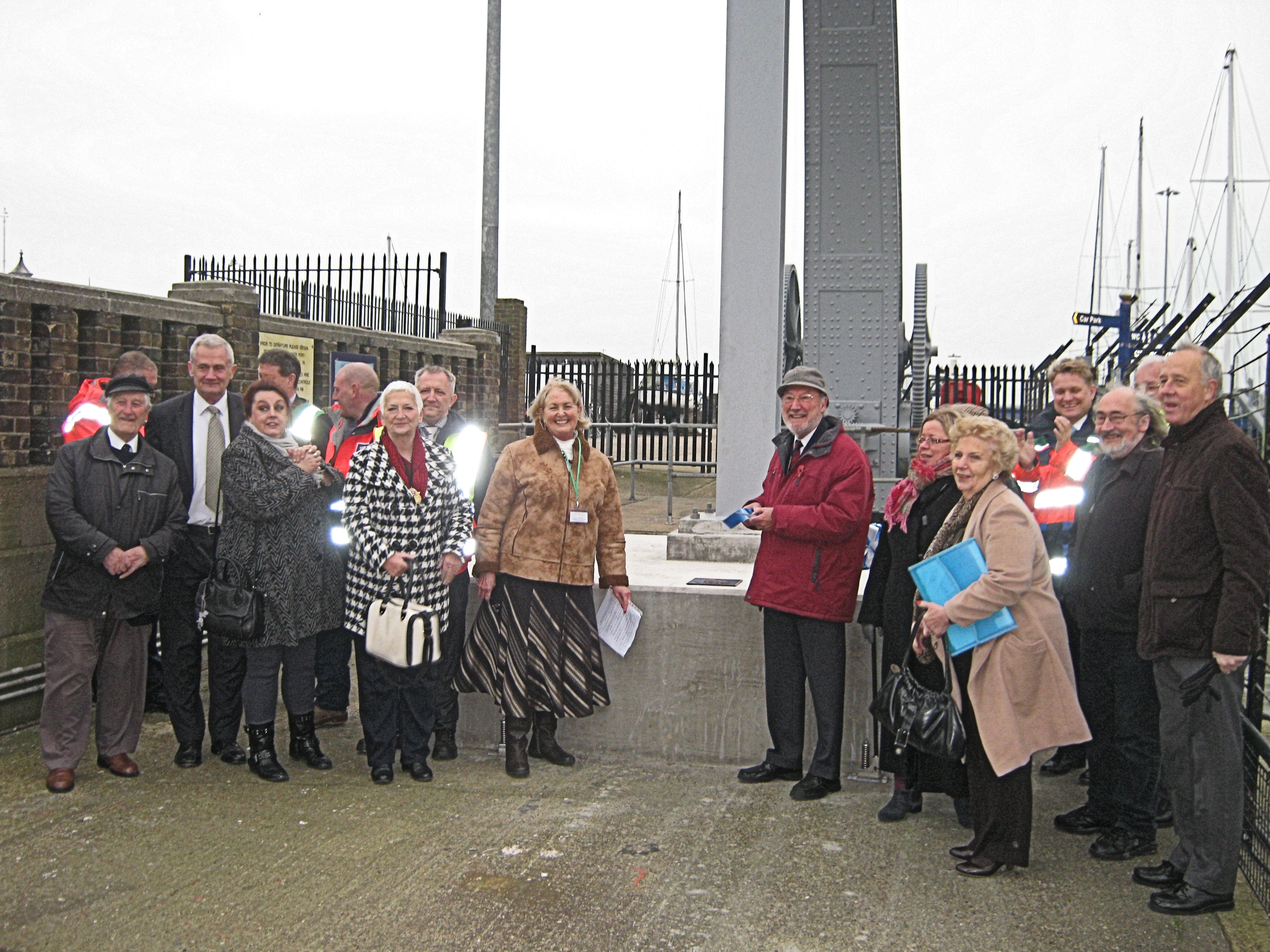 Fairbairn Crane – Cutting the ribbon ceremony following a makeover. 1 December 2014. This author in brown jacket wearing a dogtag.