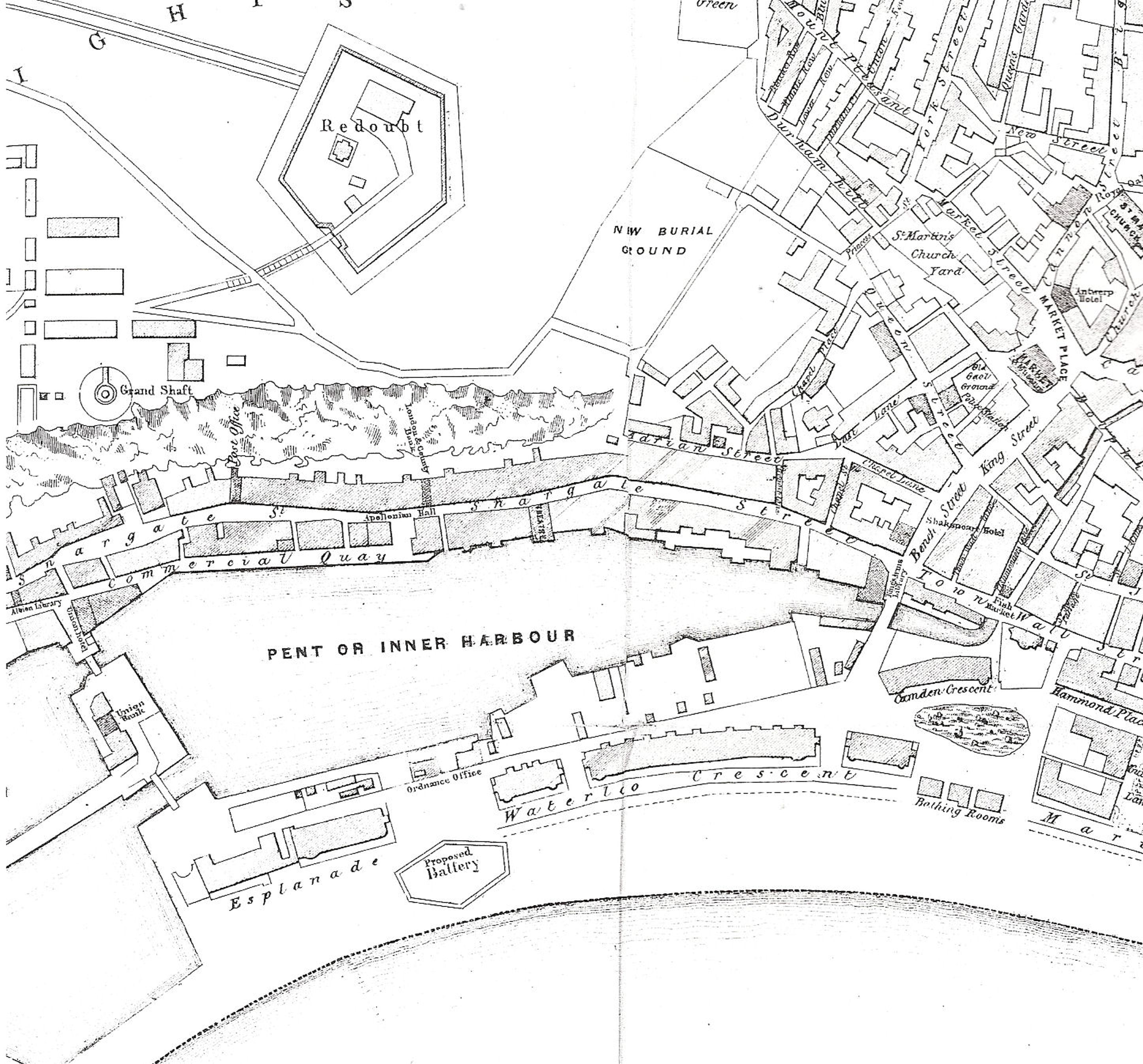 Two years before, in 1844, saw South Eastern Railway Company bring the railways to Dover. The track running on a low-lying timber viaduct across the shingle of Shakespeare Beach to the terminal in Beach Street called Town Station! Prior to this time most of Dover’s shipbuilding activity took place on Shakespeare Beach. Some of the shipbuilders received compensation and most relocated along Ordnance Wharf, alongside Cambridge Road, and Commercial Quay, on the opposite side of Wellington Dock. Much of the mud lifted during the excavation was dumped at the side, which had extended and widened the Commercial Quay. On this new created land, Northampton Street was laid and completed in 1854.