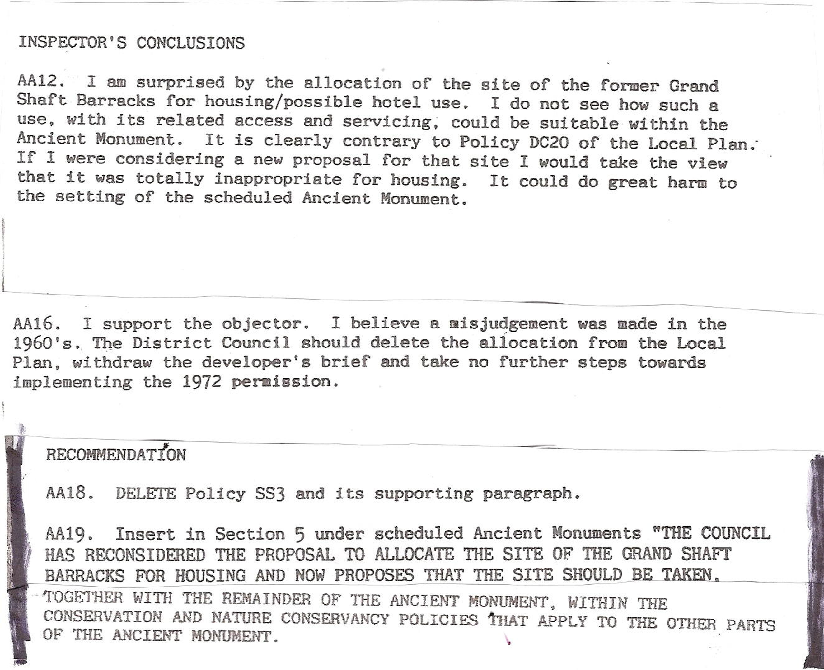 The Hearing lasted one day and the author was supported by husband Alan and one witness, Jack Phillips. The fight was gruelling and although the media were not in attendance, it was expected that we would lose at great expense to the ratepayers of Dover. However, the Planning Inspector upheld our objections, writing, ‘Even if I could be persuaded that some developer could produce an exceptional scheme that would be suitable for the site I would still take the view that the allocation should not be made. I say that because once an allocation is made there is a limit to what a local planning authority can do to maintain special standards.’ Neither the 1996 nor the 2002 Local Plans approved of similar developments on the Western Heights and this was reflected in the current Local Development Framework.