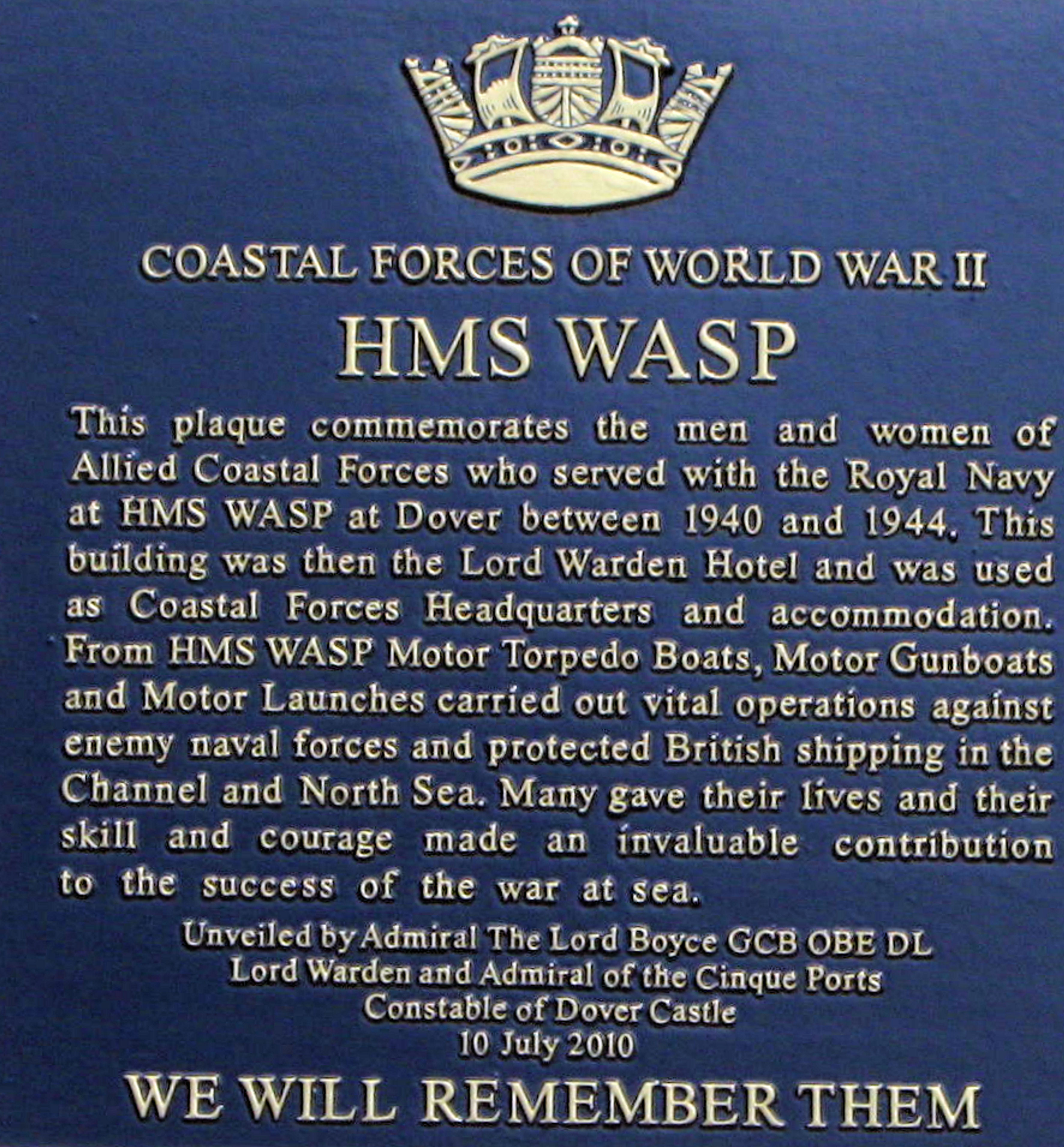 During the War the Hotel was shelled but survived and HMS Wasp was decommissioned on 14 November 1944. A plaque was unveiled in the foyer to commemorate the event but has since disappeared. On 10 July 2010 Admiral Lord Boyce, the Lord Warden, unveiled another plaque on the front of the building. Again, this is to commemorate the men and women of Allied Coastal Forces who served with HMS Wasp.