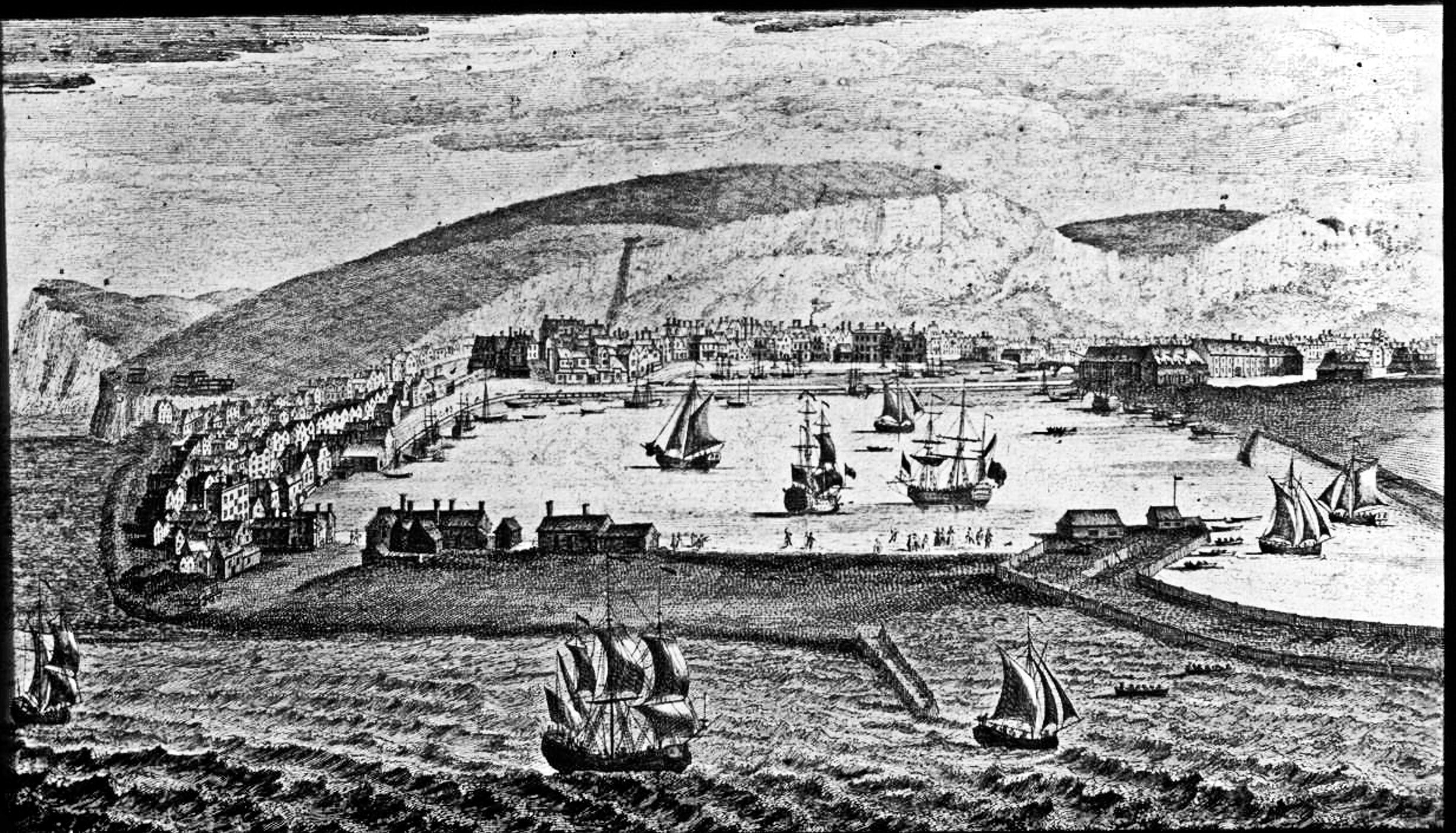 In 1723, Dover lost 66% of the Passing Tolls, revenue earned from ships traversing the Dover Strait. It was out of this money that harbour maintenance was paid and had been transferred to the Port of Rye. That port, in their petition, said that the Dover Harbour Commissioners had failed in constructing a shelter for shipping. The unofficial harbour master in Dover was James Hammond and his son, also called James organised the mud deposits in the harbour to be shovelled by hand onto carts and dumped out at sea. They also had gateway fitted into the Pent, now Wellington Dock, so that water, from the River Dover, collected there could be used together with the tidal water collected in the Bason, to clear the harbour entrance. Again, it was not very successful and the problem was exacerbated when the Castle Jetty was built in 1753.