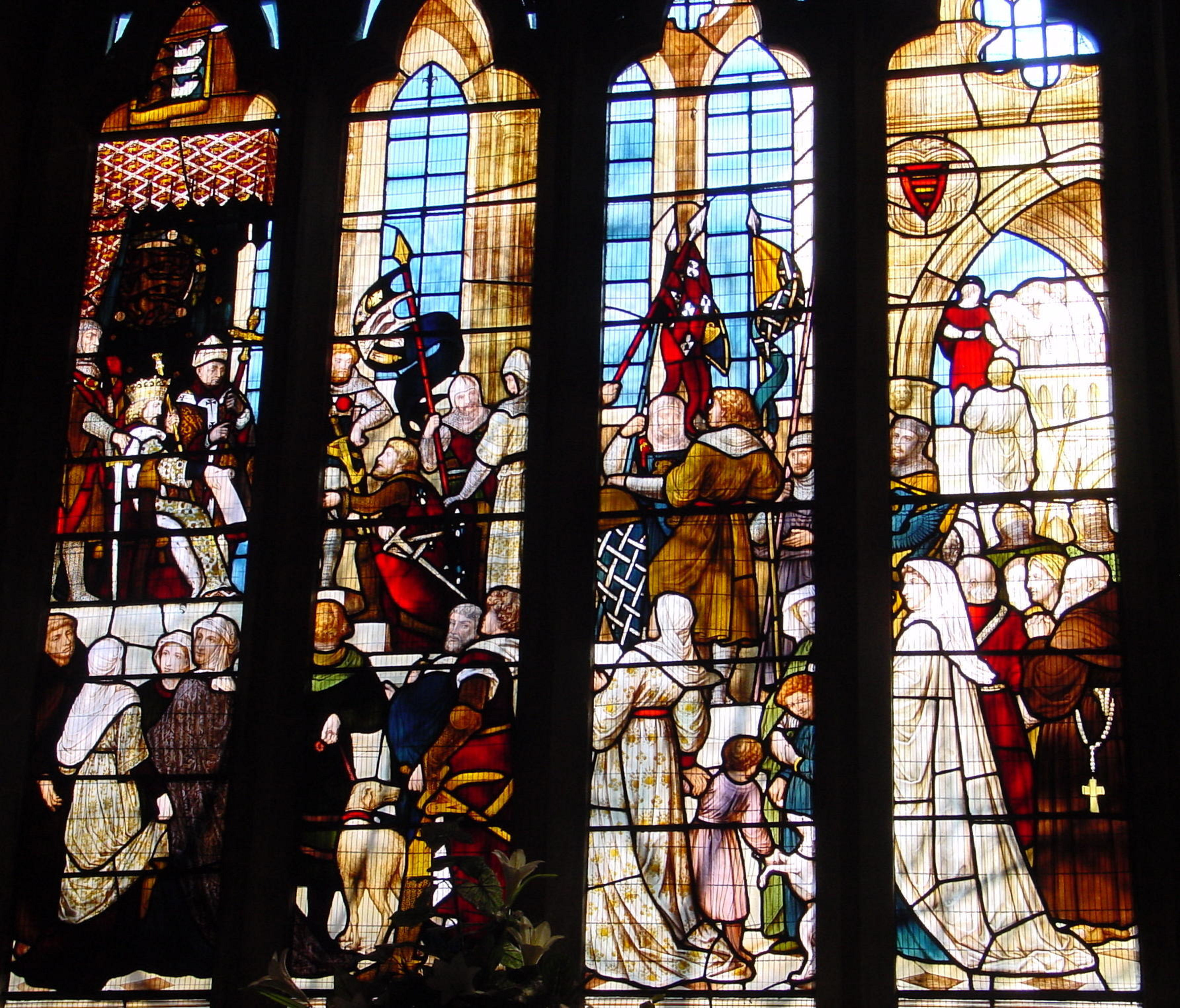 The Window shows Edward III (1327-1377), prior to his second expedition to France in 1359, making a short speech to his followers. They answered with shouts of ‘God and St George!’ The King, his sons and commanders are shown in the foreground and can be identified by the arms on their surcoats. On the left side of the King is Edward the Black Prince (1330-1376), distinguished by the dark colour of his armour. To the right, in the next light, is Sir Bartholomew Burghersh (c1329-1369) and next to him is a knight with a mantle embroidered with the Order of the Garter – founded in 1348. The ship is being pushed off by sailors and the stern is decorated with the banners of Thomas Beauchamp, 3rd Earl of Warwick (1314-1369) and Roger de Mortimer 2nd Earl of March (1328-1359). The occupants can be identified from the arms shown on the surcoats and include Sir James Audley (c.1318–1369) and Humphrey de Bohun (1342-1373) 7th Earl of Hereford, 6th Earl of Essex, 2nd Earl of Northampton
