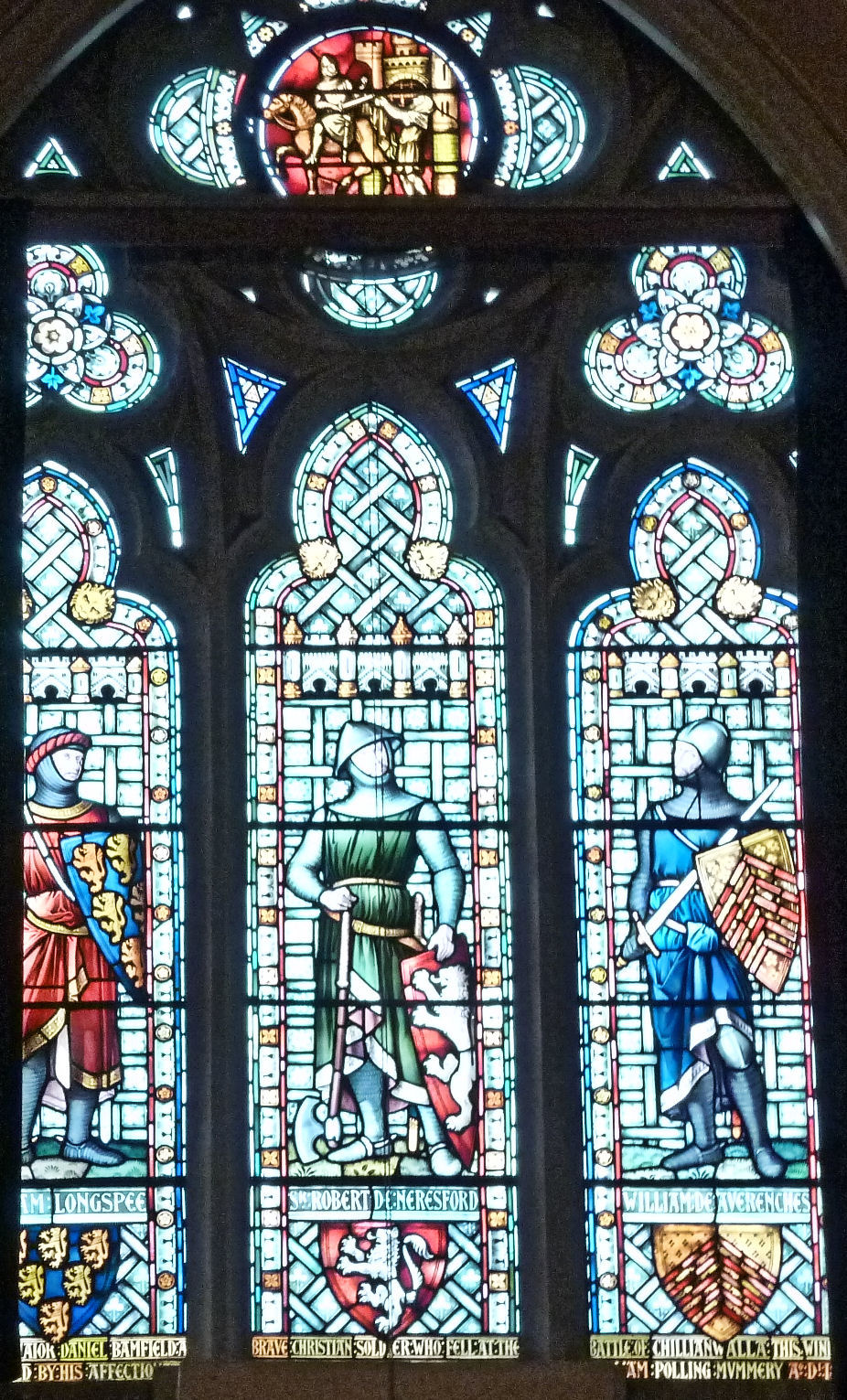 West windows from left to right first: William Longspur or Longspee / Sir Robert de Neresford / William de Averenches or Averanch the first Constable of Dover Castle to be appointed Lord Warden (1226-1227). This window was in memory of Major Daniel Bamfield – 56th Bengal Native Infantry who died of wounds on 13 January 1849 aged 44 at the Battle of Chillianwala. It was presented by Elizabeth Bamfield, wife of William Polling Mummery in 1886.