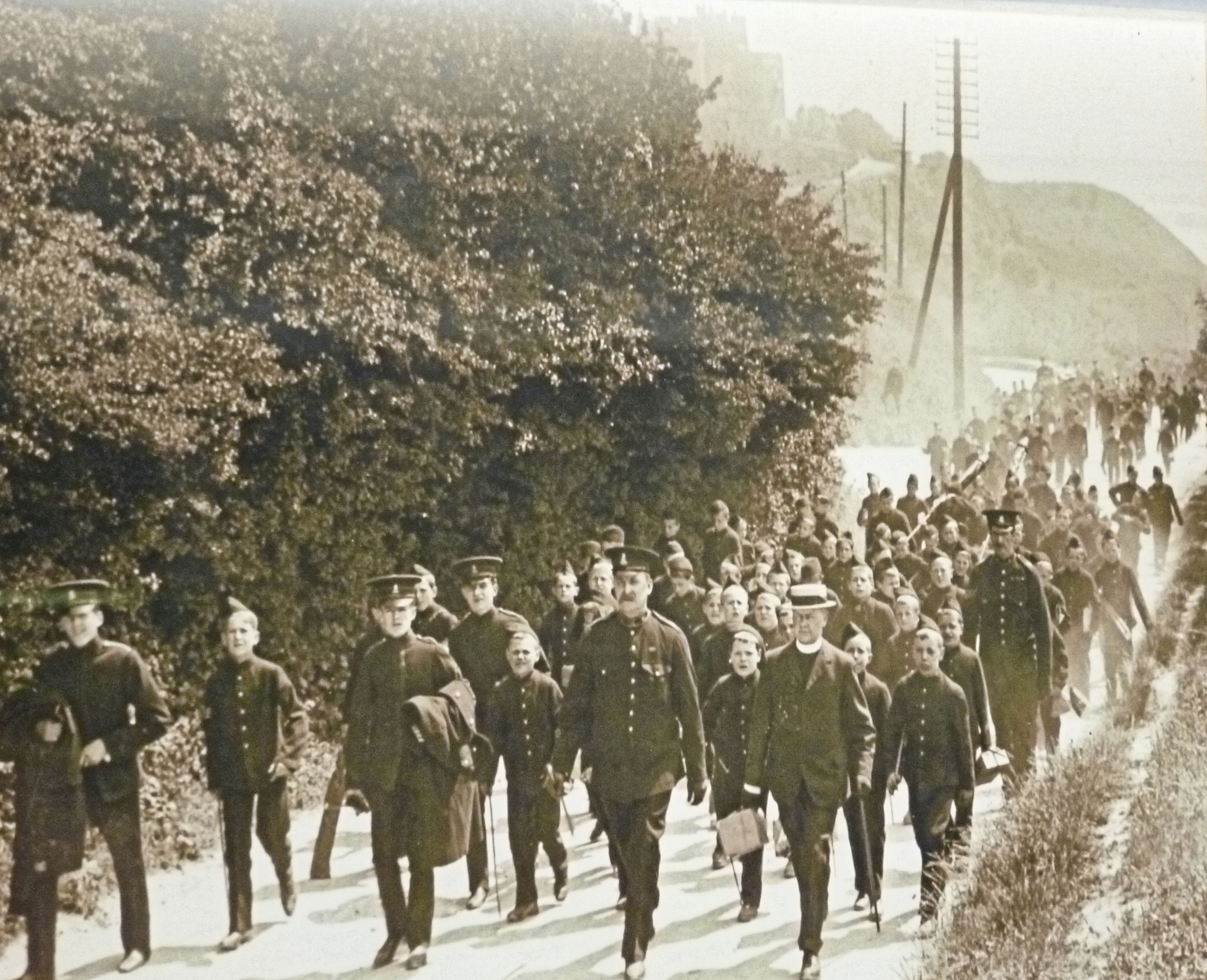 On 20 November, Lady Grosvenor, the wife of Dover’s MP, George Wyndham, laid the foundation stone of the new school. Costing £215,086, it had its own swimming pool and post office and was ready in the spring of 1909. The first students arrived at Harbour Station 11 July and in their distinctive uniform, they marched through the town and up the hill to the new school. One can only guess what the boys and the staff felt that day, but the town rejoiced. The official opening of the school was on 15 July but there was no official celebration. Chaplain-General Bishop Taylor-Smith dedicated the chapel on 15 September that year.