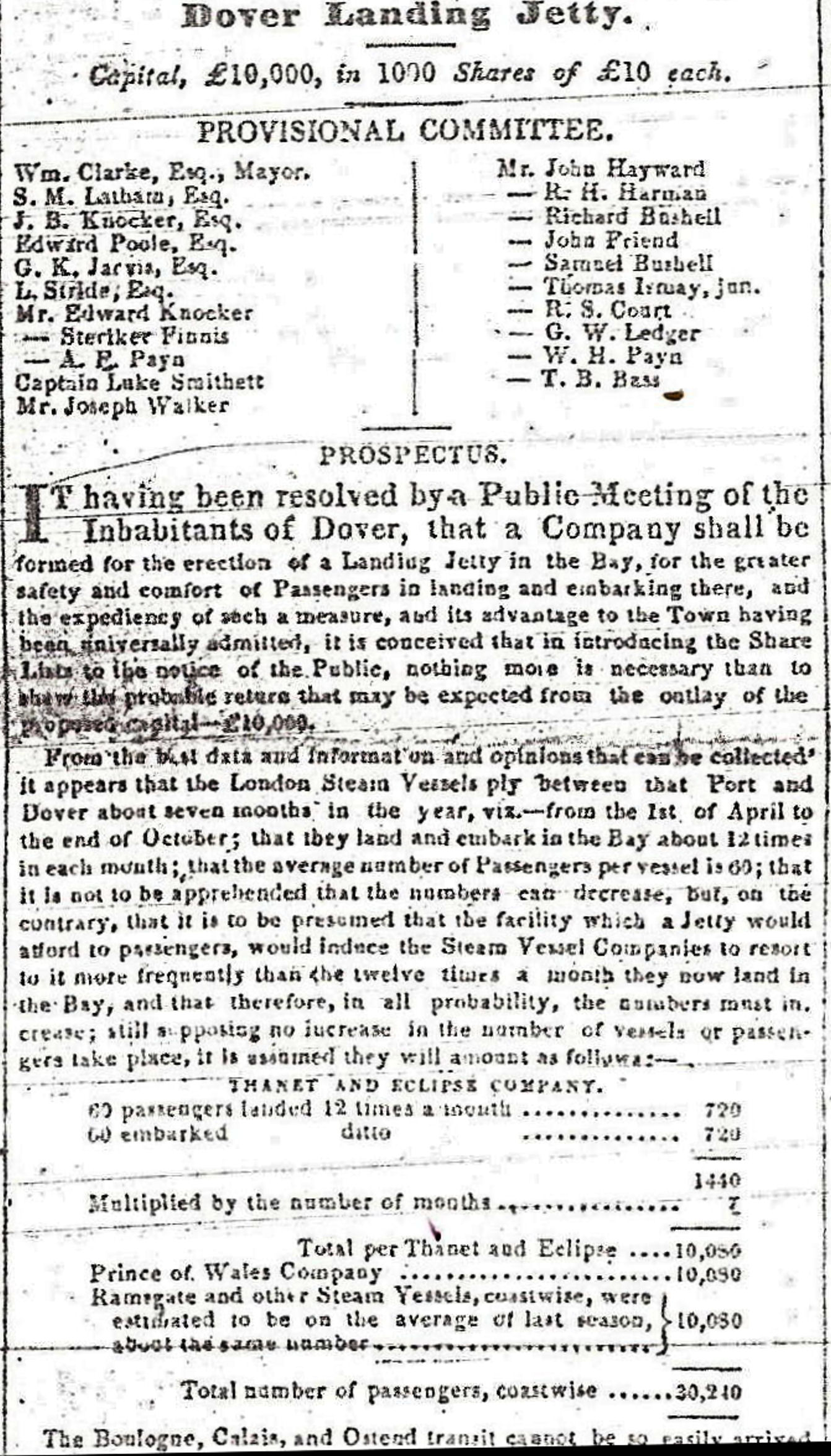 Steam driven vessels had been introduced in the 1820s and generally cross Channel ships were getting larger and carrying more passengers and goods. In March 1844, the Dover Landing Jetty Company was floated and once built it was believed that there would be no more need for boatmen as ships could tie up alongside. The jetty was to be opposite Waterloo Crescent and it was estimated that £10,000 of capital was needed. The Committee included local businessmen, Thomas Bass, Steriker Finnis, John Hayward, George Jarvis, Edward Knocker, John Knocker, Samuel Latham, Luke Smithett, Lewis Stride and Joseph Walker. The South Eastern Railway Company offered to buy £3,000 of the shares and the remaining ones sold quickly. The first pile of the Jetty was driven in 1847 and although the Dover Landing Bill was not introduced into Parliament until 4 February 1848, it received Royal Assent on 9 June that year.