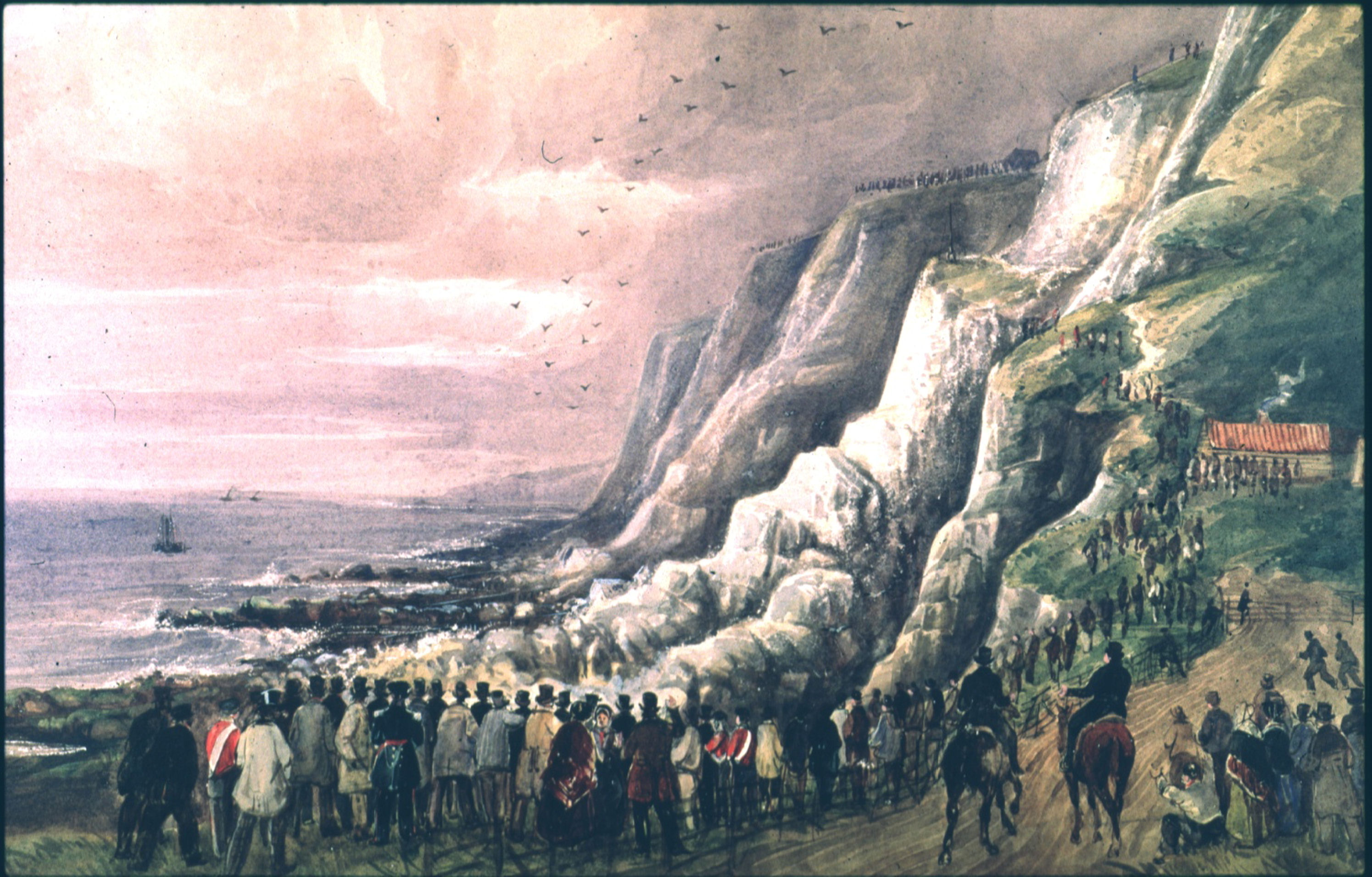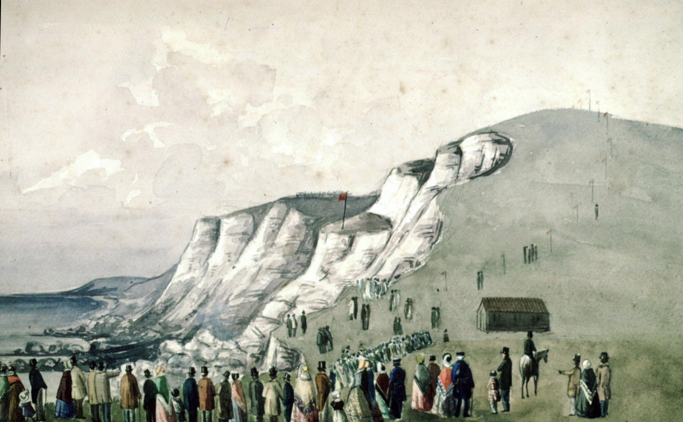 A lighted fuse was thrown over the cliff edge and at 14.26hrs, a dull, muffled boom could just be heard at the same time there was a heavy jolting movement of the earth. The bottom of the cliff, according to one bystander, ‘seemed to dissolve.’ Then the face of the cliff slowly sank giving way to clouds of chalk. This rotated as it made its way up the new cliff face and then fell back into what was, by this time, a fermenting, foaming sea. There was no loud explosion, smoke or fire and all that could be heard were the gasps of the audience.