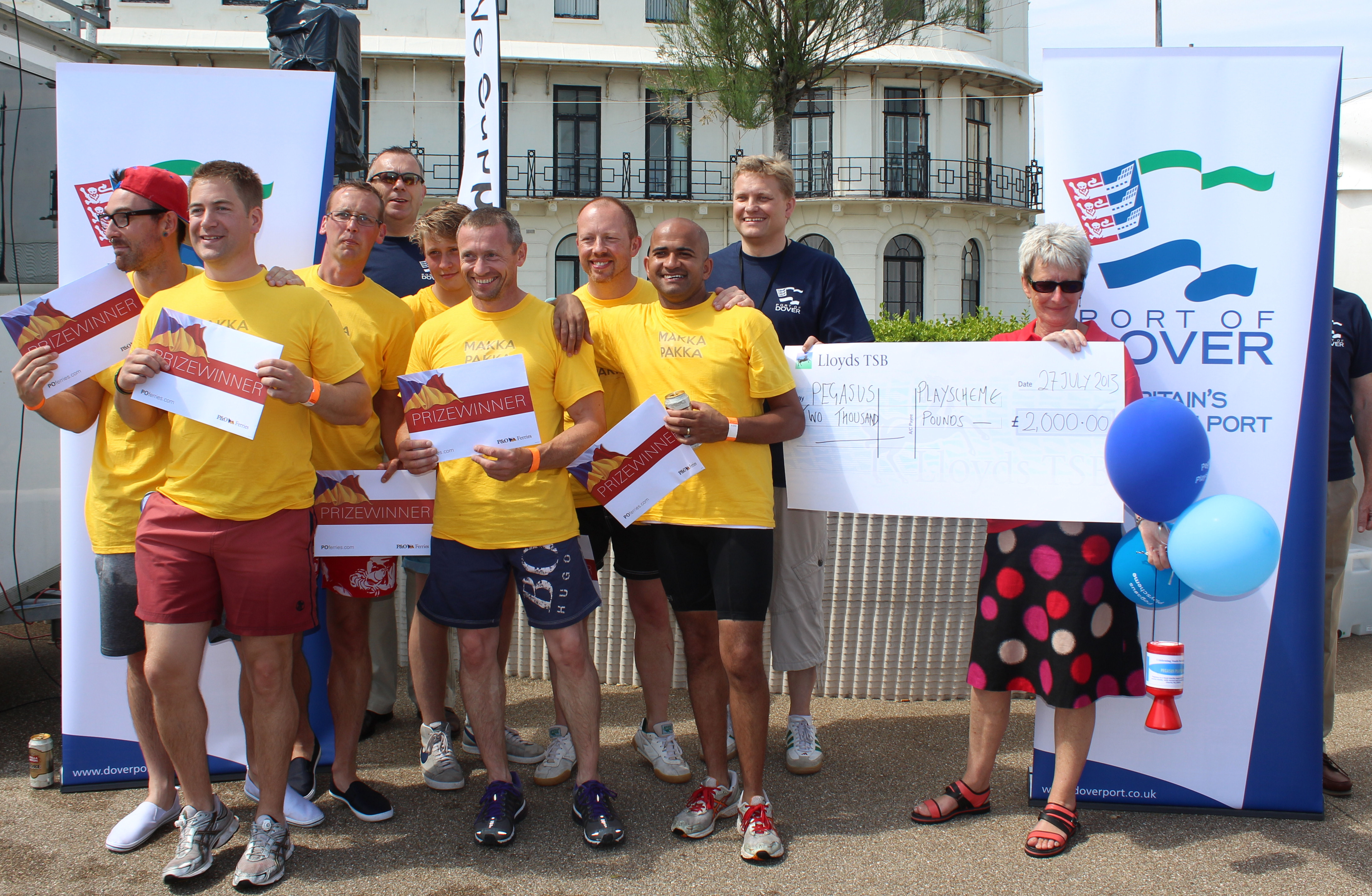 Pegasus, a local charity received a cheque for £2,000 and winners Makka Pakka team – Dover Regatta 2013. DHB