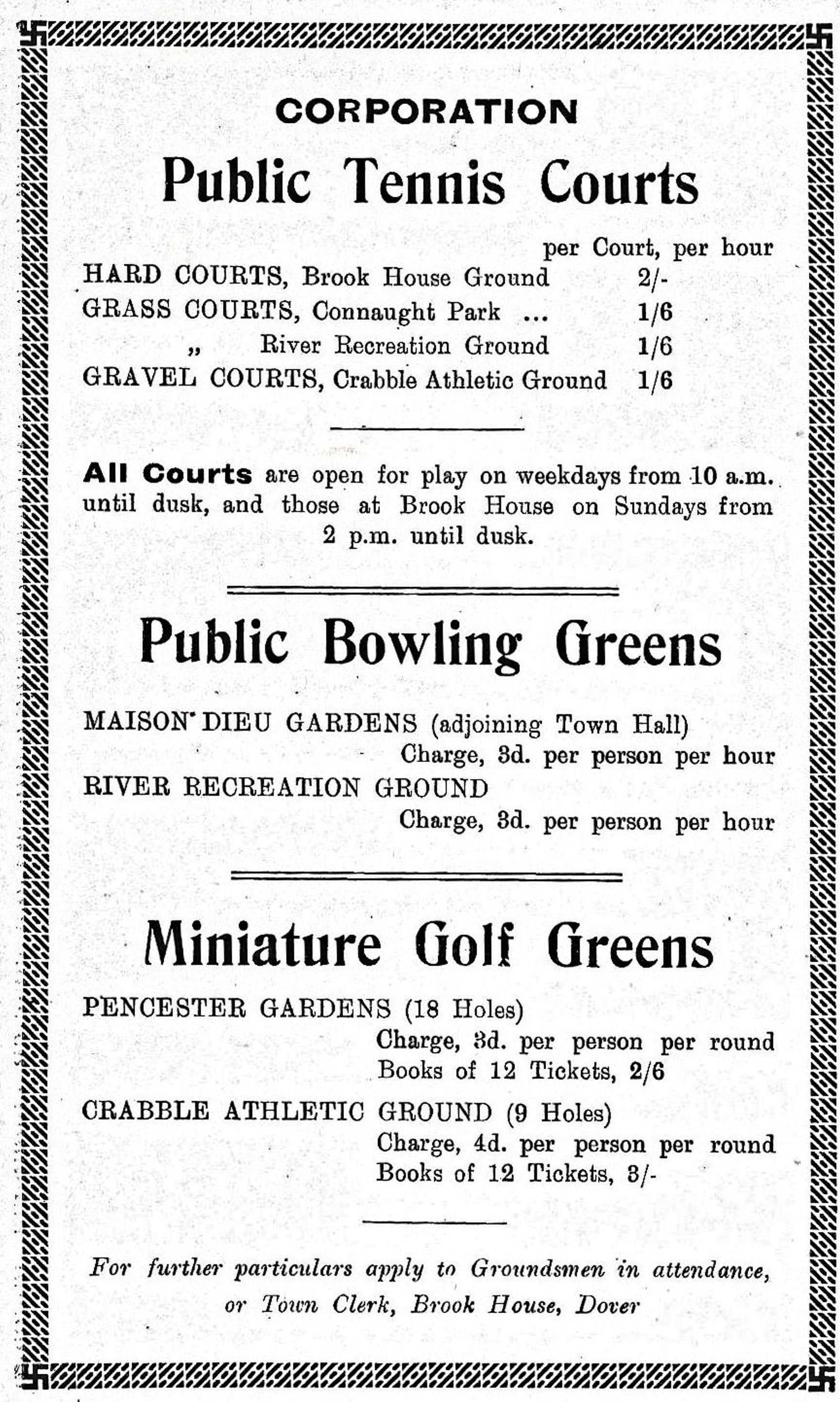 About the same time the Co-operative Sports Club were given leave to use the DIBC Green and in 1934, the first round of Kent singles were played there. The following year DIBC decided to replace their pavilion, built in 1911, and to change their name to the Dover Bowling Club. Their colours were changed to light and dark blue. Other clubs in Dover, at this time, included River – founded in 1923, Post Office, East Kent Road Car, and the Police. For the most part, the greens were provided by the Corporation.