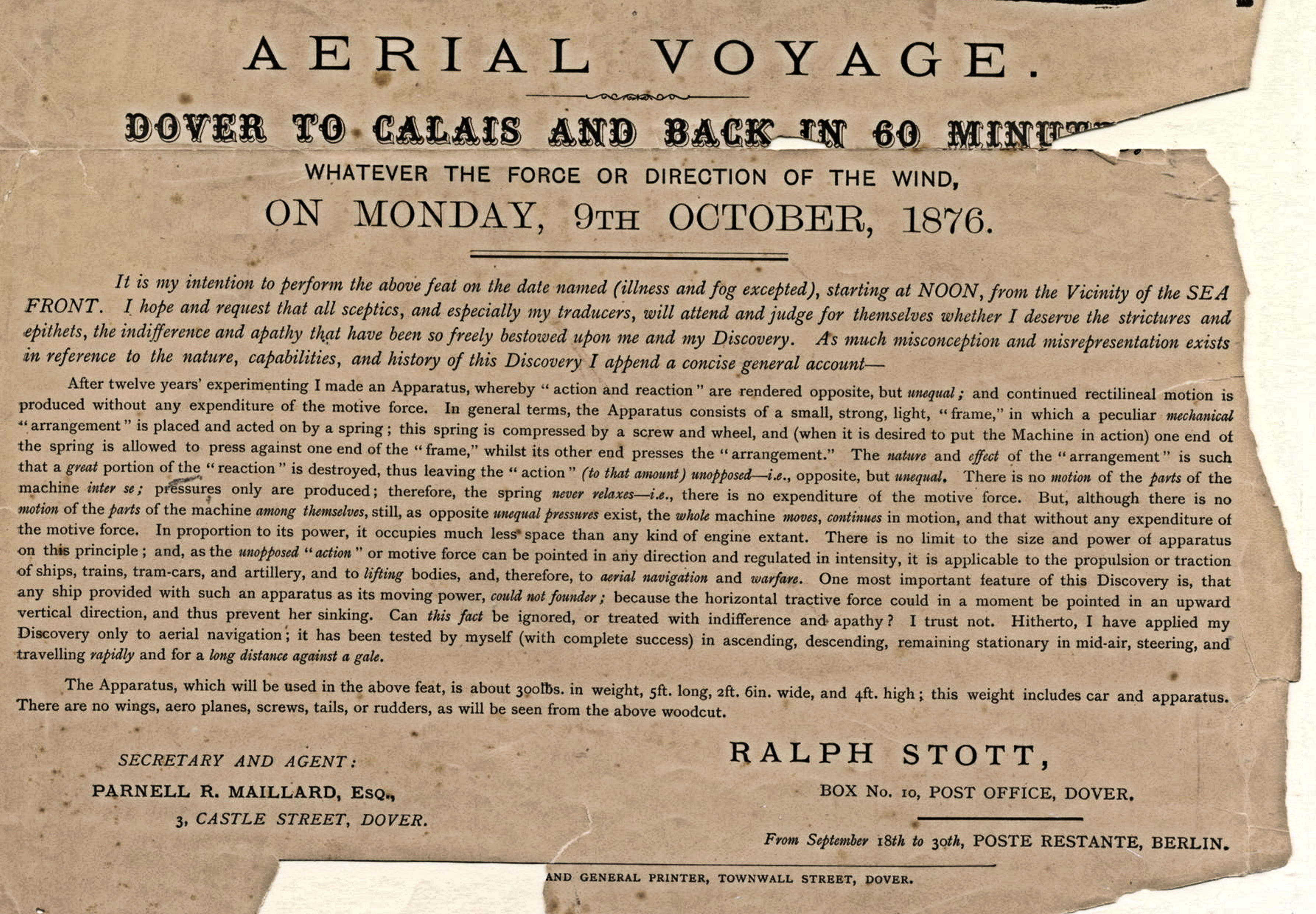 Ralph went on to say that he hoped that all sceptics ‘and especially my traducers,’ would attend and judge for themselves whether ‘I deserver the strictures and epithets, the indifference and apathy that have been so freely bestowed upon me and my Discovery.’ The proposed flight was to take place on 9 October 1876 from the Royal Cinque Ports Yacht Club, then further up the seafront on Marine Parade.
