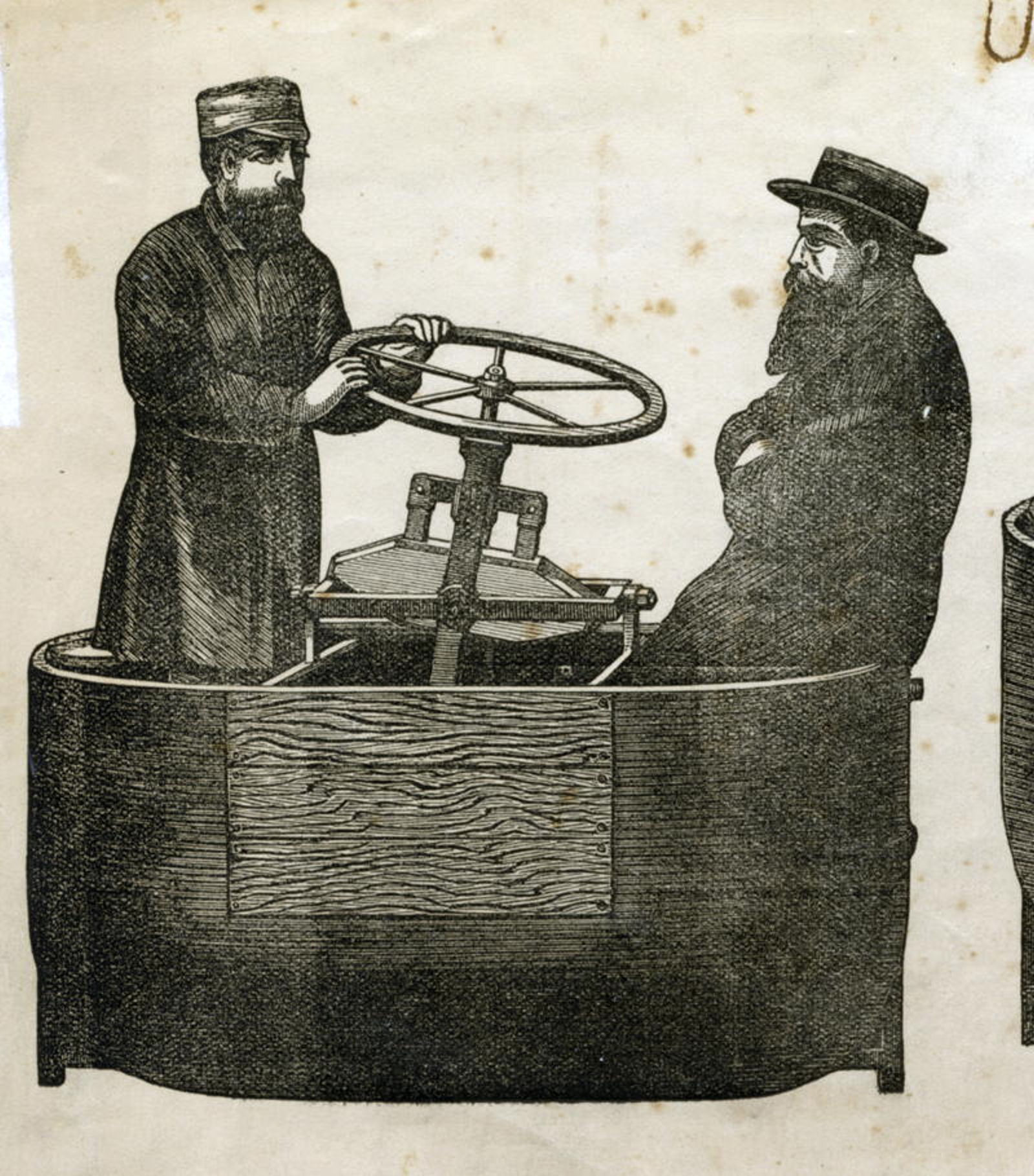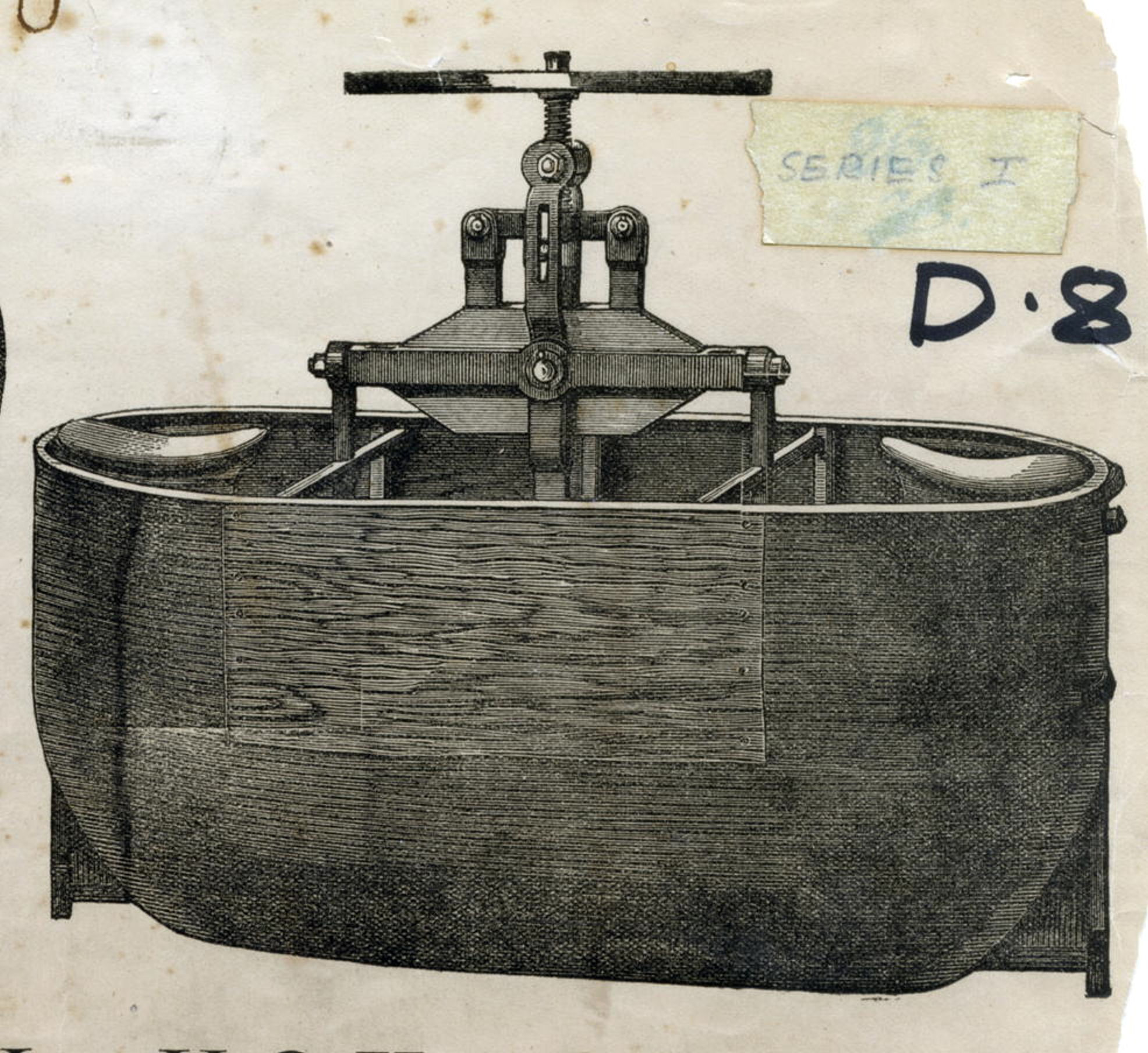 The poster shows two drawings, one with two men in the machine giving the indication of size, the other is just of the machine. It was shaped like a bathtub and, according to Ralph, ‘fitted with an arrangement acted upon by a spring compressed by a large screw and a wheel.’ The spring, he said, was pressed against the frame at one end, and the screw, which is in the middle, at the other end. Apart from the screw and wheel, the machine had no moving parts – such as a rotor – and relied on ‘pressures produced.’
