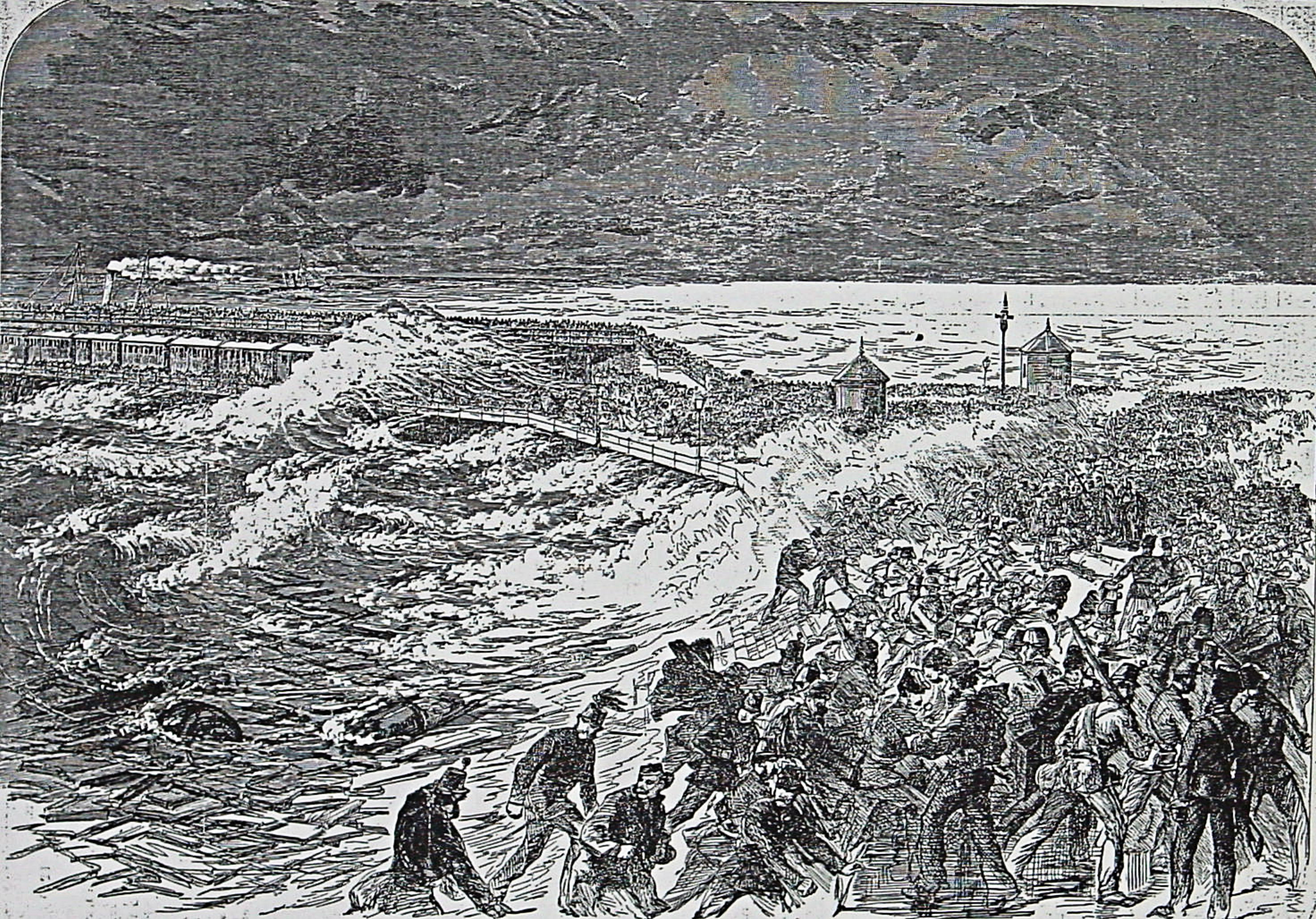 On the roofs of trains that had drawn up at the Harbour Station the passengers were watching the disaster unfold before them. Suddenly the little vessel appeared to break free and there were audible sighs of relief. She righted herself and as her two masts rose majestically above the Admiralty Pier in an upright position, the crowd cheered. Then her masts slowly arced towards the sea and the she was lost.