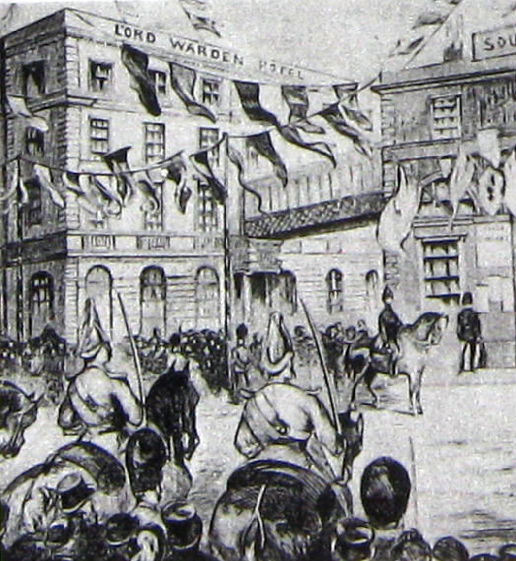 Following the formal opening of Connaught Park the procession wended its way down Park Avenue, still thronged with cheering crowds, along Park Street to the Town Hall. There, local women scattered fresh flowers in front of the Duchess, as she climbed the steps. Then the royal couple, together with 450 guests – many of them leading inhabitants of the town – enjoyed a grand luncheon followed by the Duke of Connaught declaring the Town Hall open. Mayor Dickeson paid most of the expenses for which he was later knighted.