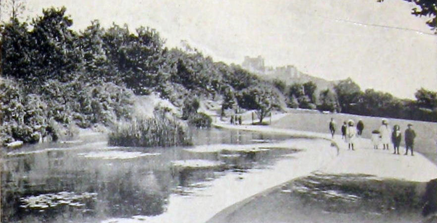 After the creation of the terraces, walks were laid with the intention that the pedestrian could walk from Charlton to the Castle entrance opposite the Constable’s Tower and along the way have extensive views of the sea, harbour and Western Heights. A miniature lake was formed with a fountain in the middle. Nearby a stone drinking fountain was placed that had been bought by Dr Astley and there were ample boarders for flowers. The nursery had a modern hot house where plants could be grown or bought in and kept for planting out to ensure that the flowerbeds would look beautiful from early spring to late autumn. During the winter, appropriate bushes would fill the beds and during the Christmas season be dressed with seasonal garlands.