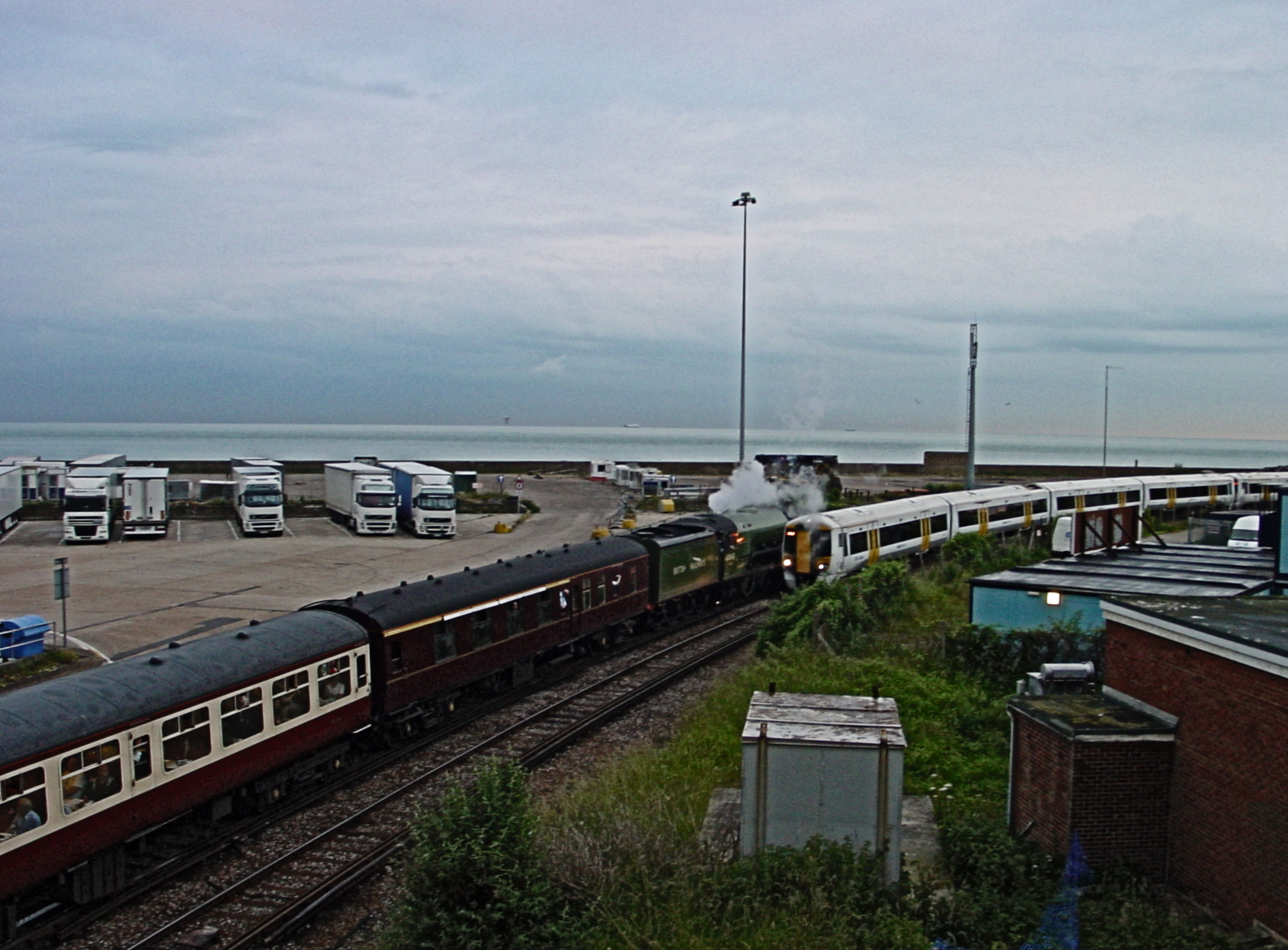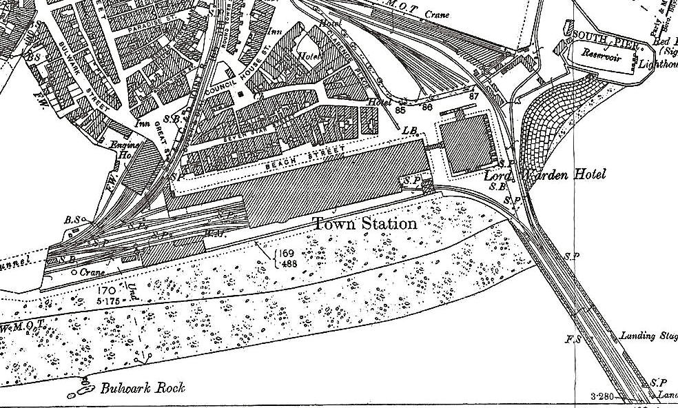 The old four-line railway track was replaced and by Act of Parliament, the footbridge spanning the railway to a promenade on Shakespeare Beach connected with the then landward side footpath. New engine sheds were built nearby and were opened on 9 November 1929. A large coaling tip was erected and what remained of the Town Station was demolished except for the offices. In October 1934 the Southern Railway Marine Department Divisional were moved from Admiralty House, on Marine Parade, back to their original offices in the old Town Station!