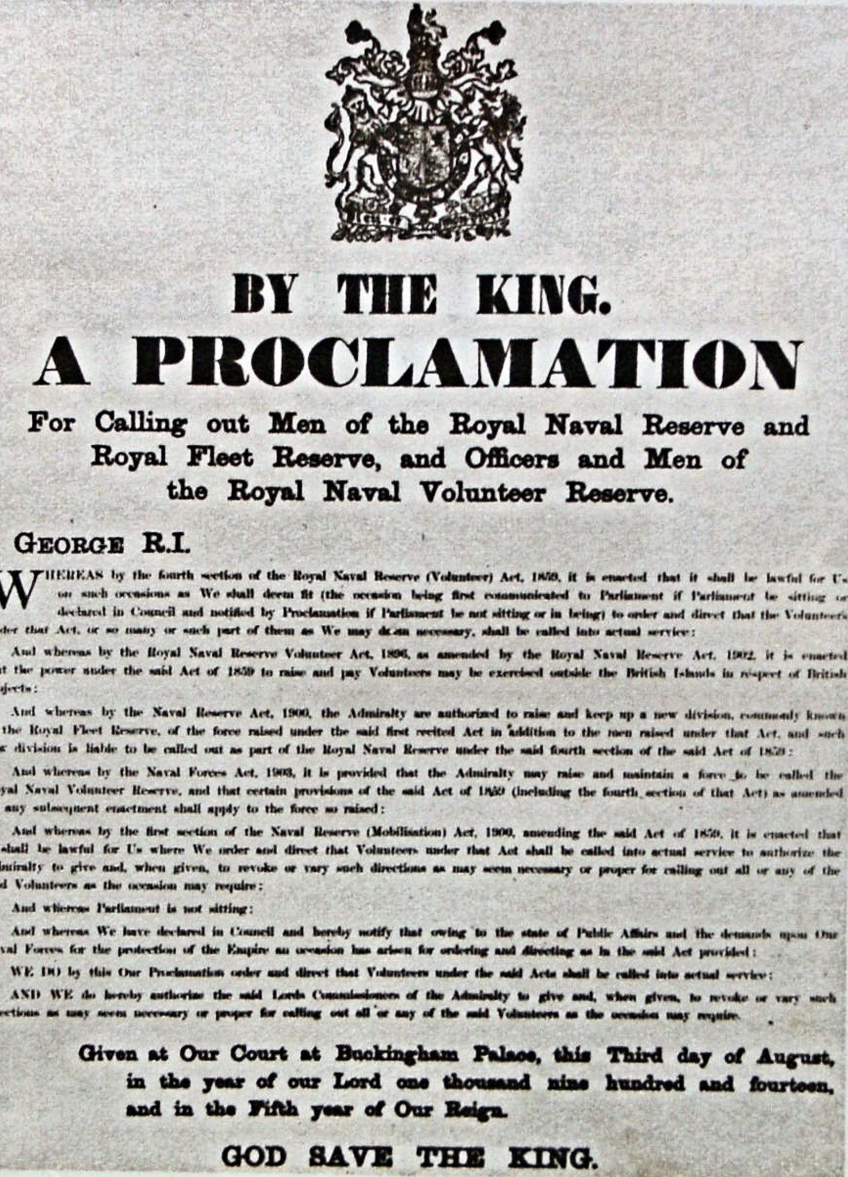 Russia joined in on the side of Serbia on Sunday 2 August and France was immediately embroiled. Germany declared war on France and proceeded to march through Belgium, thus violating the Treaty of London of 1839. This recognised and guaranteed the independence and neutrality of Belgium and confirmed the independence of the German-speaking part of Luxembourg. By Bank Holiday Monday, 3 August, it was clear that only a miracle could avert Britain being drawn into the conflict. At 03.00hrs, a telegram was sent to Southsea Castle ordering the Dover Unit of the Cinque Ports Territorial Force of Royal Engineers to return to Dover at once. George V (1910-1936) issued a Royal Proclamation calling up the Royal Navy Reserve, Royal Fleet Reserve and Officers and Men of the Royal Naval Volunteer Reserve.