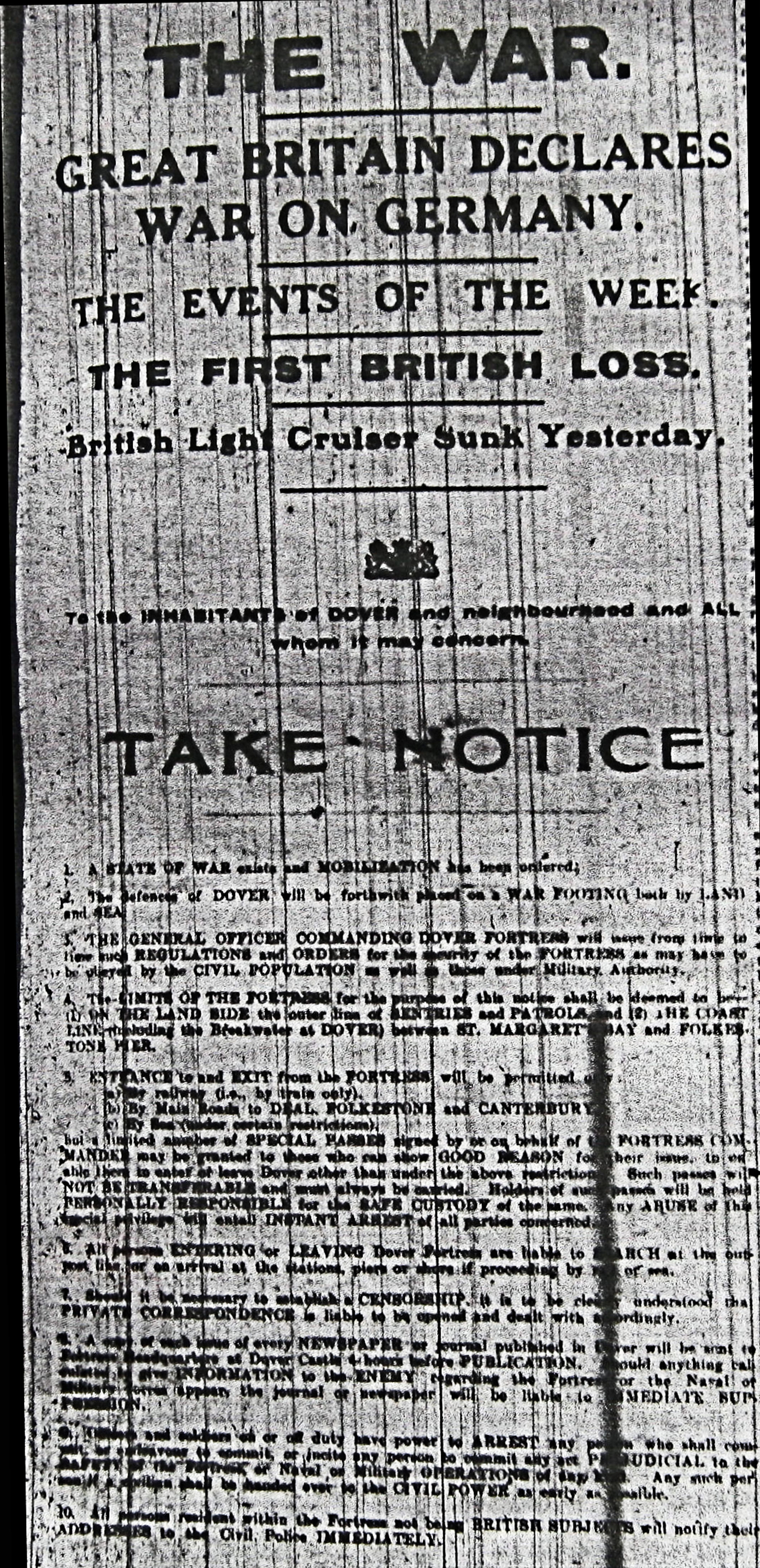 It was not until 23.00hrs on Tuesday 4 August 1914 that Britain declared war on Germany in accordance with the written obligation of 1839 to uphold the neutrality of Belgium. Promptly notices signed by Mayor Edwin Farley and Brigadier-General Crampton, stating that war had been declared and mobilisation had been ordered. Defences of Dover were placed on a war footing on both land and at sea. Entrance and exit to, the now Fortress Dover, could only take place by the railways and the main roads to Folkestone, Deal and Canterbury. Special passes, limited in number, were necessary for those who required entering or leaving the town. The Military Authorities had the power to arrest and search. All local newspapers were subject to censorship by the military and anyone approaching any defensive works were stopped, questioned and searched.