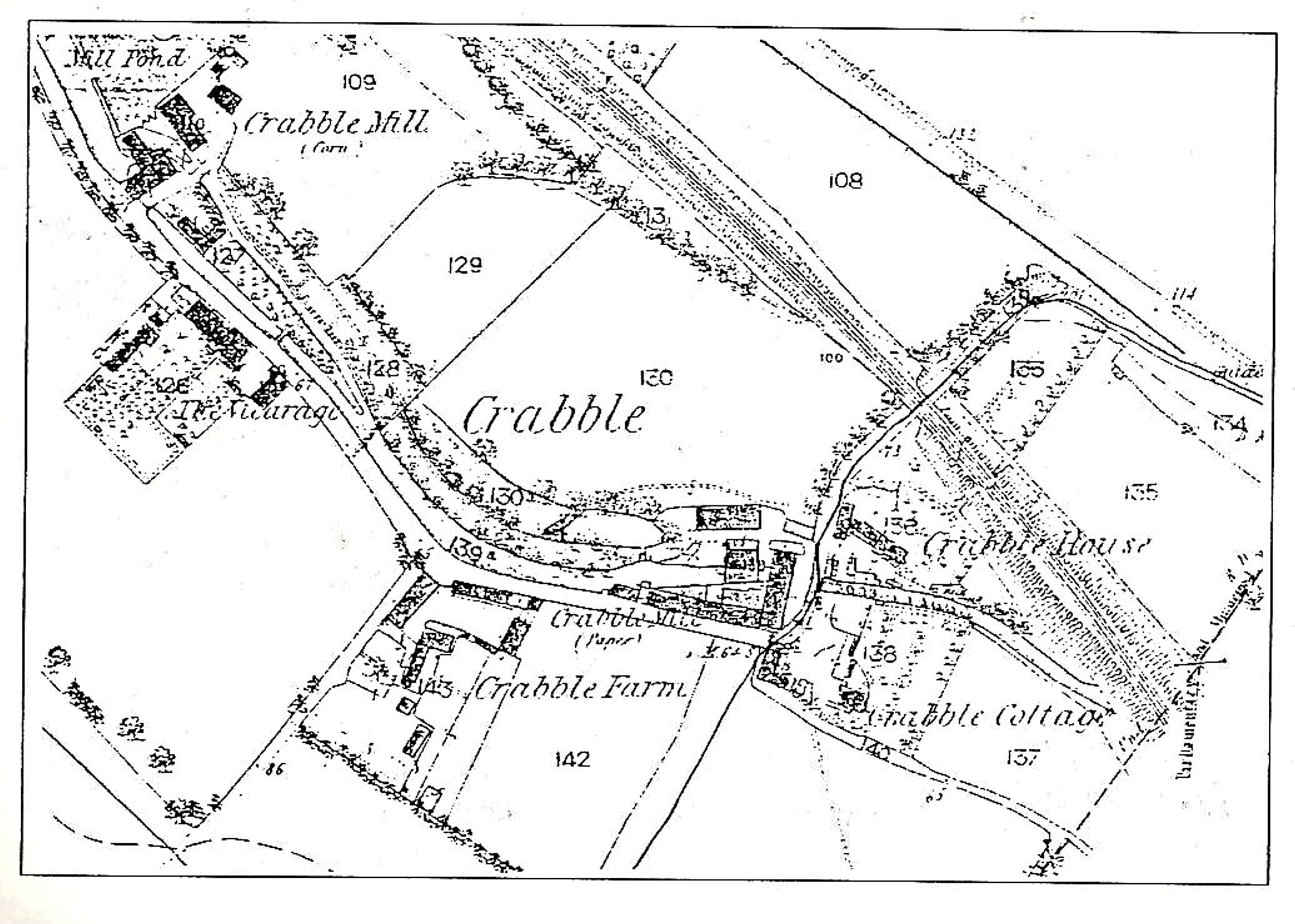 Crabble is a hamlet in the village of River. The village is situated about two miles from Dover and is a combination of high hills with a deep valley through which the River Dour flows. The old A2 London Road is on the east side and up until 1977, when the Eastern Bypass opened, was the main road northward out of Dover. The western hills were once given over to farming and woodland but are now predominantly covered with housing estates. Alongside the river is the original village of River, a long straggling row of pretty cottages and meadows. There were once two paper mills, a corn mill, a seed mill and the Church dedicated to St. Peter and St. Paul. Crabble lies in a hollow at the southern end of the village. The hamlet, until the end of the 19th century contained a farm, Crabble corn mill and Crabble paper mill.