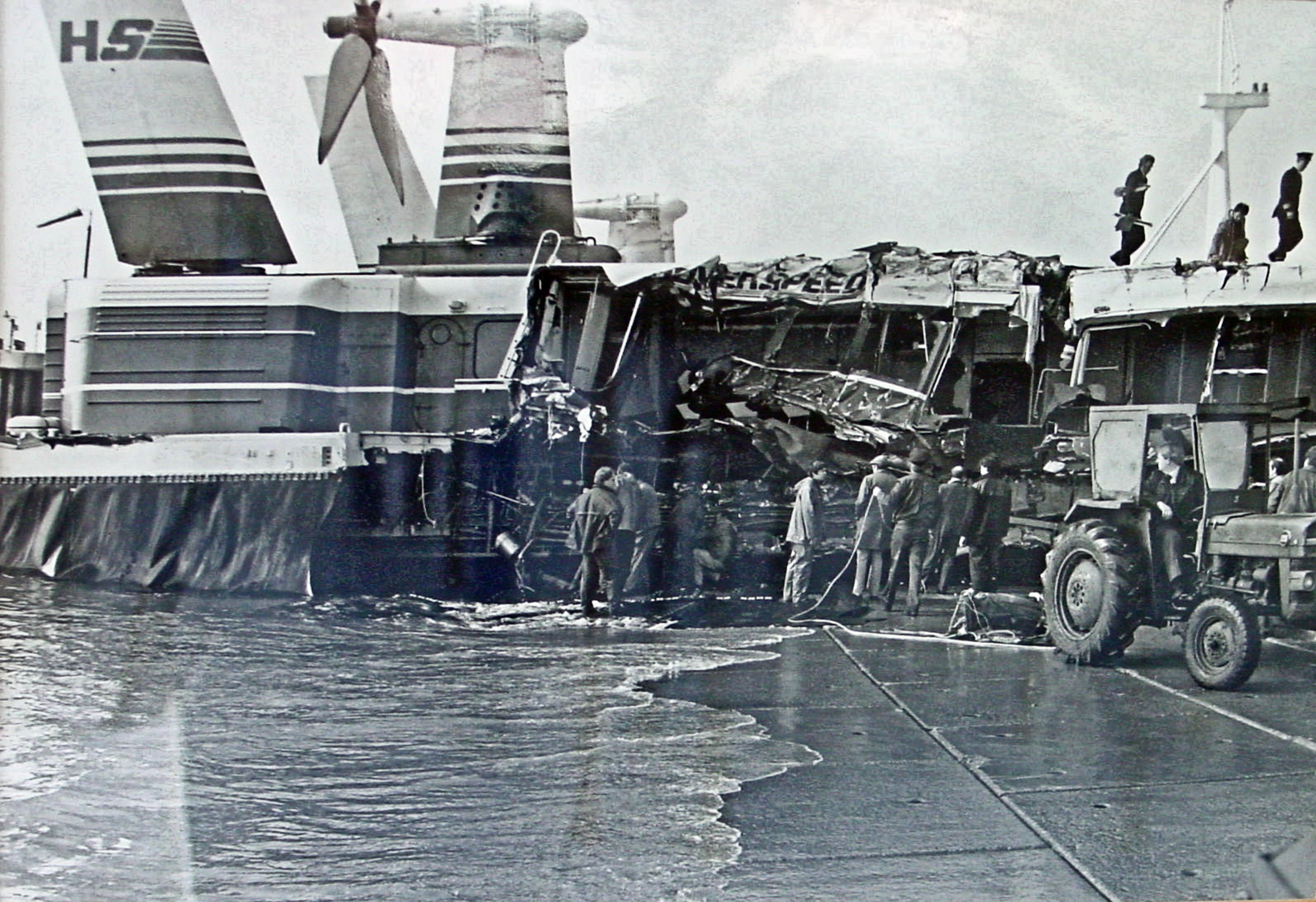 Shortly after 1600hrs on Saturday 30 March 1985 the Hovercraft, Princess Margaret, with 370 passengers on board – mainly French schoolchildren – was entering by the Western entrance. At the time, there were strong winds and heavy seas and she hit the Southern Breakwater. A number of passengers were thrown into the sea and members of the crew jumped in to rescue them. Both the Rotary Service and the tug Dexterous were prompt on the scene. After rescuing those in the sea the next job was to rescue the passengers still in their seats, none of which had seatbelts, and suspended over the tempestuous sea. The lifeboatmen ran a rope through the Prince of Wales Pier to steady the Hovercraft, and then putting Rotary Service on the damaged side of the Hovercraft, carefully helped the stricken passengers to safety. Altogether, the lifeboat crew worked for eight hours taking off 175 passengers and 8 crew as well as searching for the missing. Four passengers died in the accident.