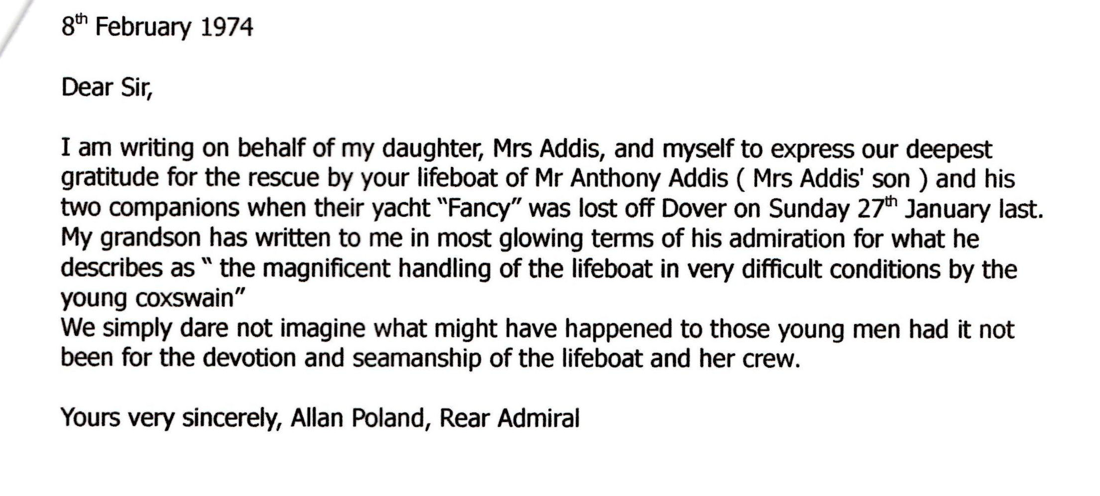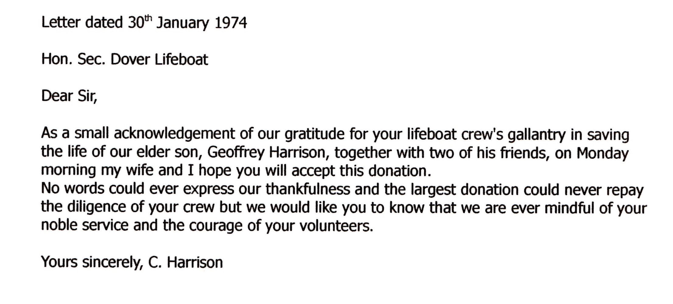 Letter from one the grandparent’s of the crew of the Fancy of Falmouth that foundered in Langdon Bay on the night of 27- 28 January 1974