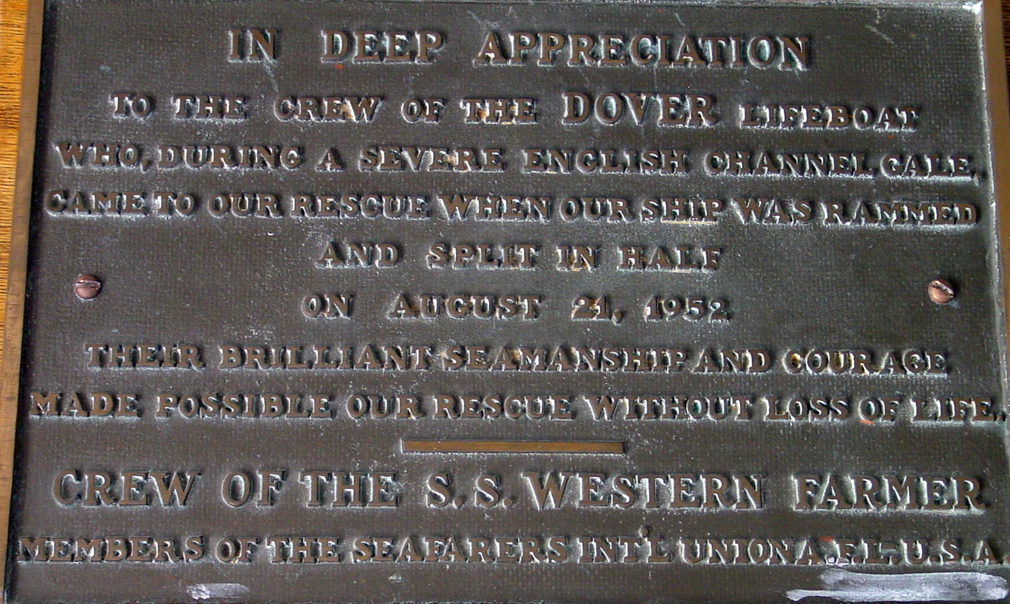The 7,239-ton liberty ship Western Farmer was hit by the 11,732-ton Norwegian tanker Bjorgholm near the Goodwin Sands in August 1952, and her bow section sank almost immediately. A distress call was made and the Southern Africa rescued the captain and the 13 crew. The remaining part of Western Farmer drifted in the Channel and with several thousands of pounds of goods on board a number of French tugs honed in for salvage. Two succeeded in towing what remained of the Western Farmer towards Calais but due to the weight of the cargo, the weather and the strong currents the wreck foundered and sank. At the Dover Lifeboat station there is a plaque from the crew of the Western Farmer, giving thanks to the Dover crew who rescued them.