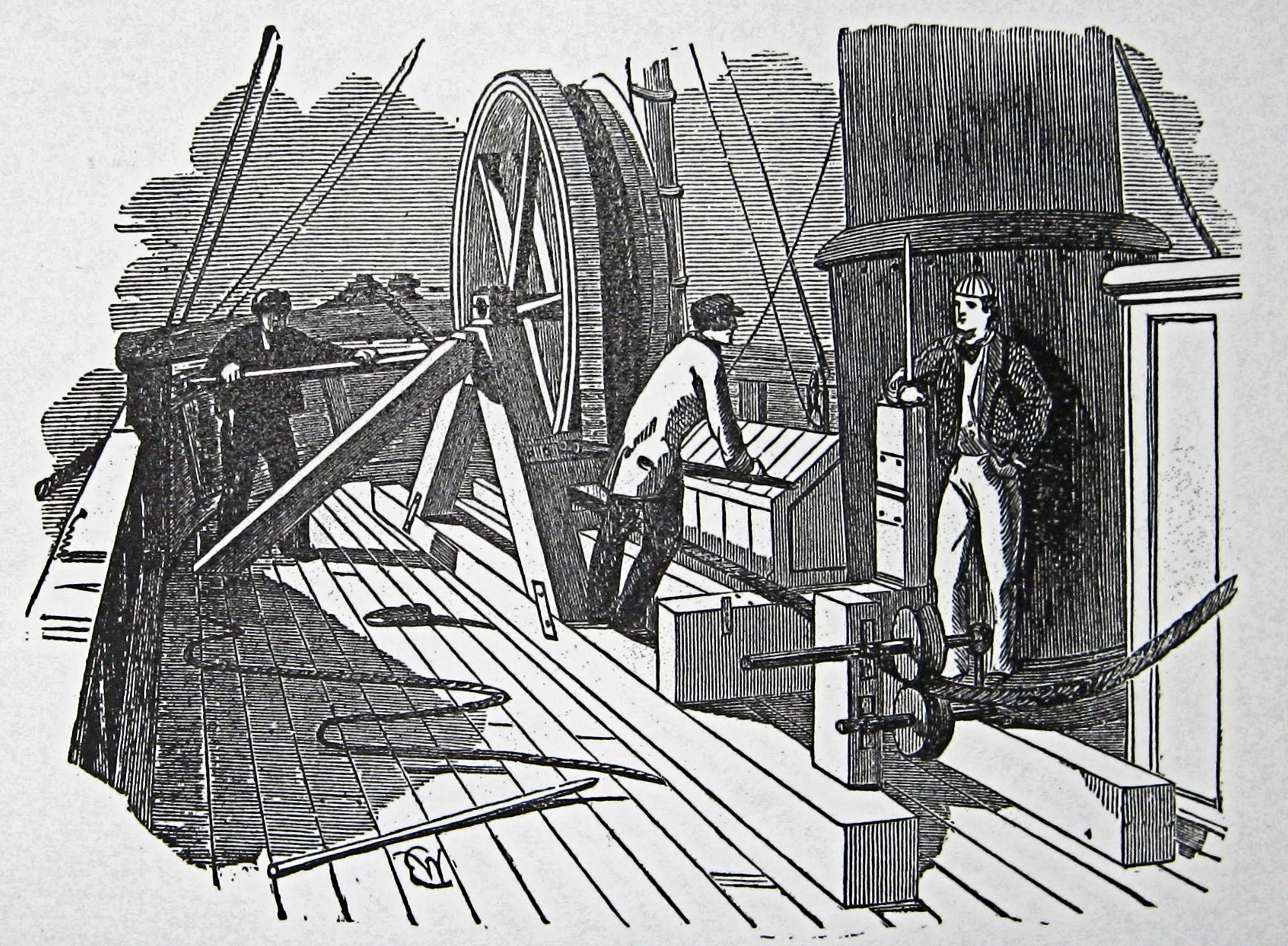 It was reported that it was a fine calm day with a favourable wind on Wednesday 28 August 1850. The Goliath, under Captain Beer with a crew of 30, accompanied by the Widgeon, under Captain Bullock, left Admiralty Pier. On board, besides scientists and engineers was John Brett. The ship followed the flagged course across the Channel, laying the cable. This was coiled around a large drum, 15-feet by 7-feet, amidships. The cable weighed five tons and the cylinder two. The last 300-yards of cable was enclosed in leaden tube to go over the ground on the French coast.