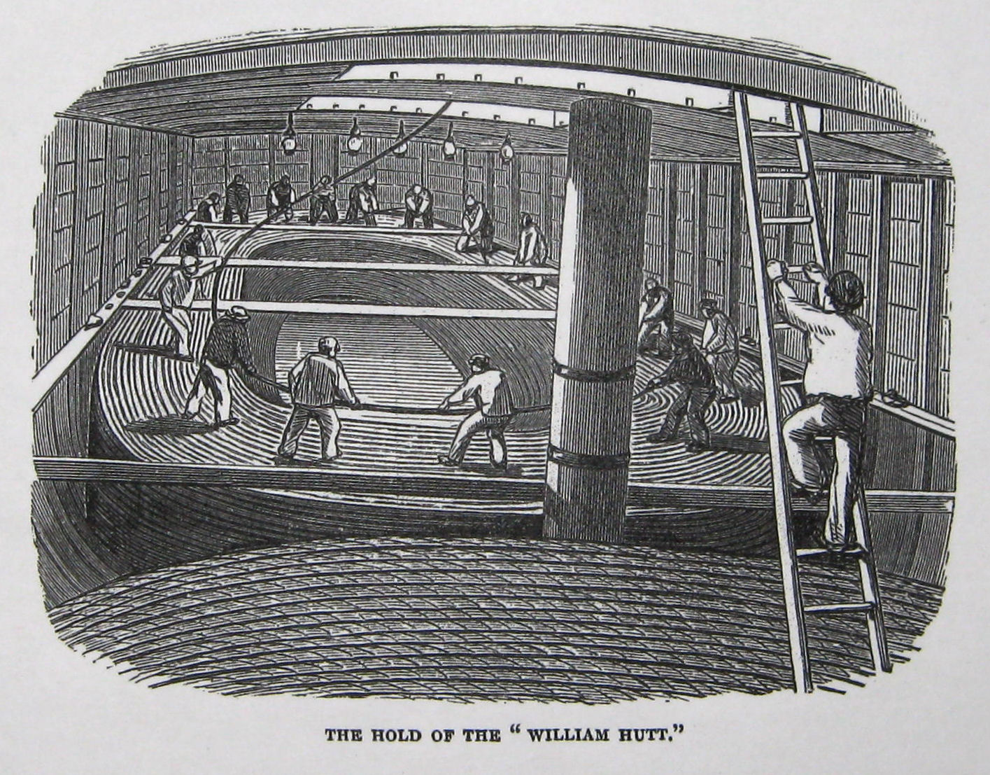 Sixteen copper wires were twisted into four wires, covered with gutta percha a ¼inch thick, and plaited by a machine in the manner of an ordinary rope around a shaft. Hemp yarn, having been previously soaked in pitch and tallow, was then tightly twisted around this and the hemp was overlaid with a series of six similar soaked hemp yarns. This was then covered with ten layers of galvanised wire, each one about ¼-inch thick. 25 miles of wire was made this way and having been rolled up was five feet in height, twenty feet in circumference and weighed approximately 20-tons.