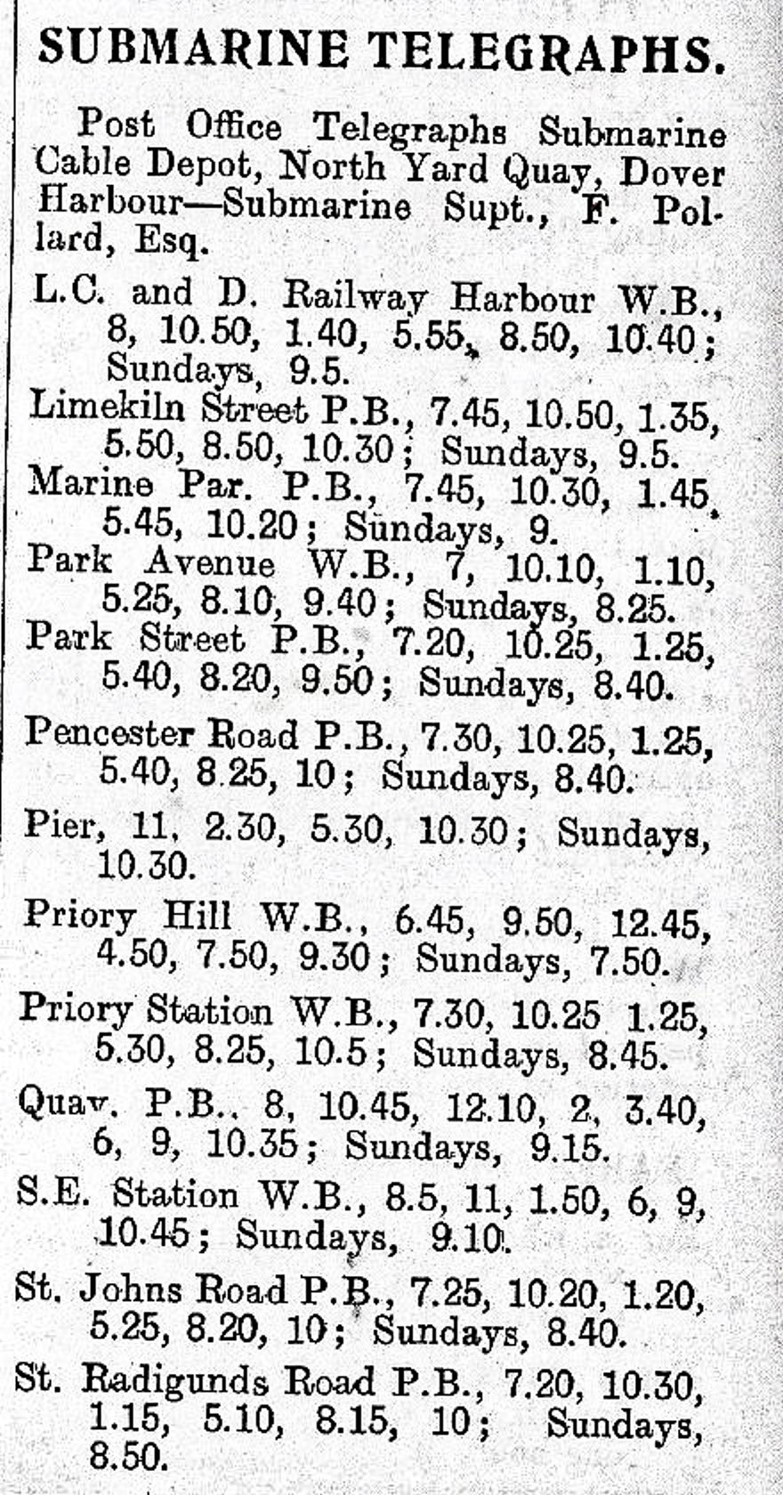 By 1898, the Submarine Telegraph Department had moved to North Yard Quay and W R Cuffey was the Superintendent. His assistant was F Pollard and the Alert was moored nearby. Ten years later the Submarine Telegraph Department Superintendent was F Pollard and the town boasted of 13 telegraph offices! On 12 May 1913, at the age of 82, the oldest telegraphist in the world, John Francis Costello died. He lived at 2 Osborne Villas, Elms Vale Road and before retirement had been with South Eastern Railway for 61years. As stated above, he was Charles Walker’s young assistant in the horsebox at Town Station on Wednesday 28 August 1850!