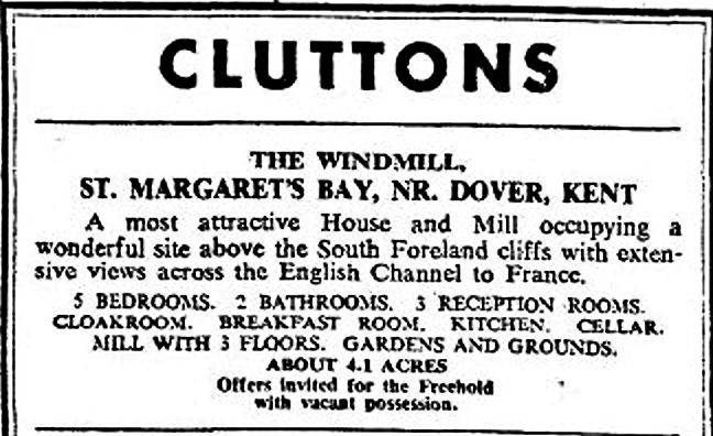 In 1972 the Windmill and house was put on the market and the advert tells us that the property, at the time, stood in 4.1 acres of grounds. The property consisted of five bedrooms, two bathrooms, three reception rooms, cloakroom, breakfast room, kitchen, cellar gardens and grounds. All the advert says of the Windmill is that it had three floors. In the 1990s, the house and Windmill was in possession of entrepreneur John Gordon (Algy) Cluff.