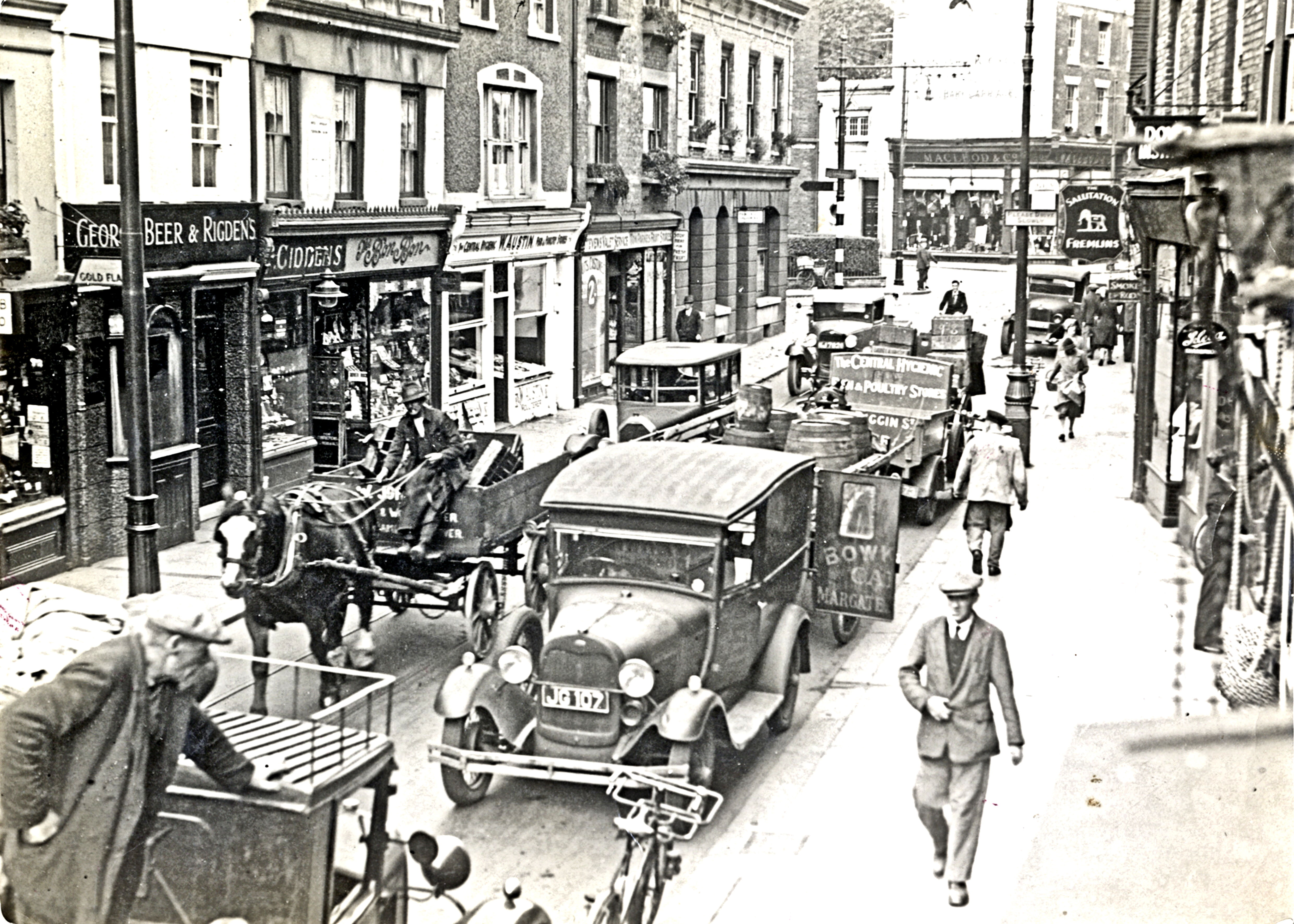 Biggin Street looking north 1930s, the man walking towards the camara is approximately outside what was no 6 where the Dover’s first public library opened in 1935. Hollingsbee Collection Dover Museum