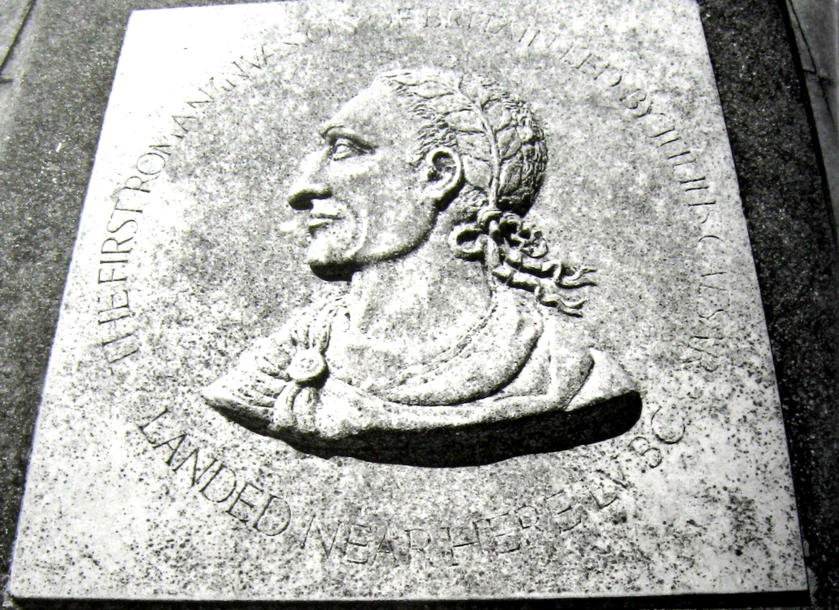 Long before Julius Caesar (100BC-44BC) commanded the first conquering expedition to Britain, the country had close trading ties with Continental Europe. Skilful warriors went from Britain to assist in repelling the advances of the Romans on the Continent. Julius Caesar’s attempted invasion was on 25 August 55BC of which he wrote in Commentaries on his Campaigns (using the third person) that ‘Caesar determined to proceed into Britain because he was told that in almost all the Gallic wars succour had been supplied from thence to our enemies.’ In a fleet of 80 ships and two galleys he ‘reached Britain with the first squadron of ships about the fourth hour of the day, and there saw the forces of the Britons drawn up in arms on all the hills. The nature of the place is this: The sea was confined by mountains so close to it that a dart could be thrown from the summit to the shore …’ Calling the place Dubris – meaning waters, it is generally assumed that he was describing Dover.