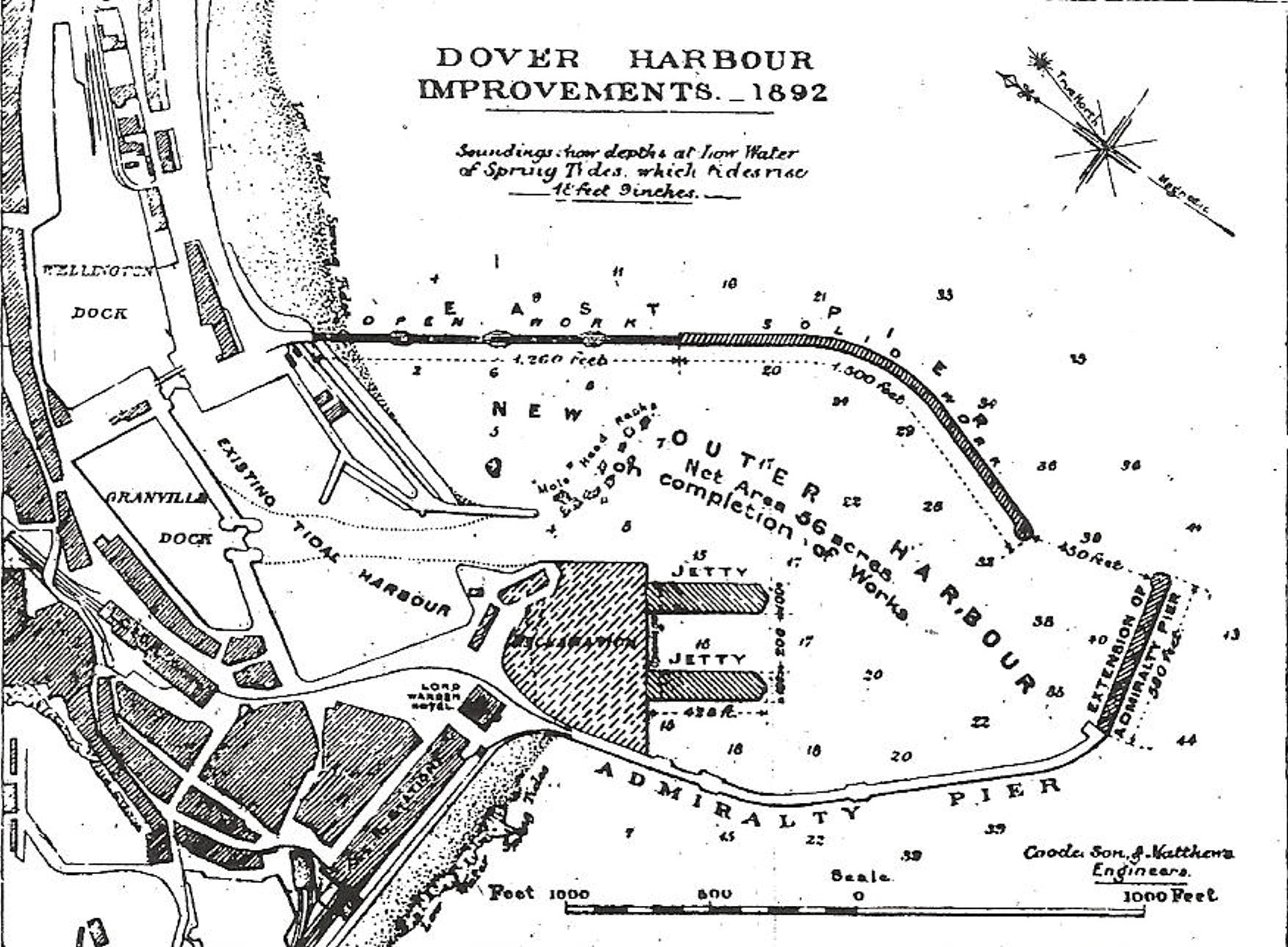 1895 saw the appointment of a new Lord Warden of the Cinque Ports, the former Prime Minister, Robert Arthur Talbot Gascoyne-Cecil, 3rd Marquess of Salisbury, by virtue of which he was the Chairman of Dover Harbour Board. By May that year 1,100-feet of the 1,500-foot solid section of the Pier had been built and that month the Admiralty announced its decision. The port of Dover was to be a base for the Royal Navy and a National Admiralty Harbour was to be built that would enclose the whole of Dover bay! The first Naval Works Act was passed in 1895 when it was estimated that the Admiralty Harbour would cost £3,500,000 and the proposal made it necessary to alter the plans for Commercial Harbour especially the Prince of Wales Pier.