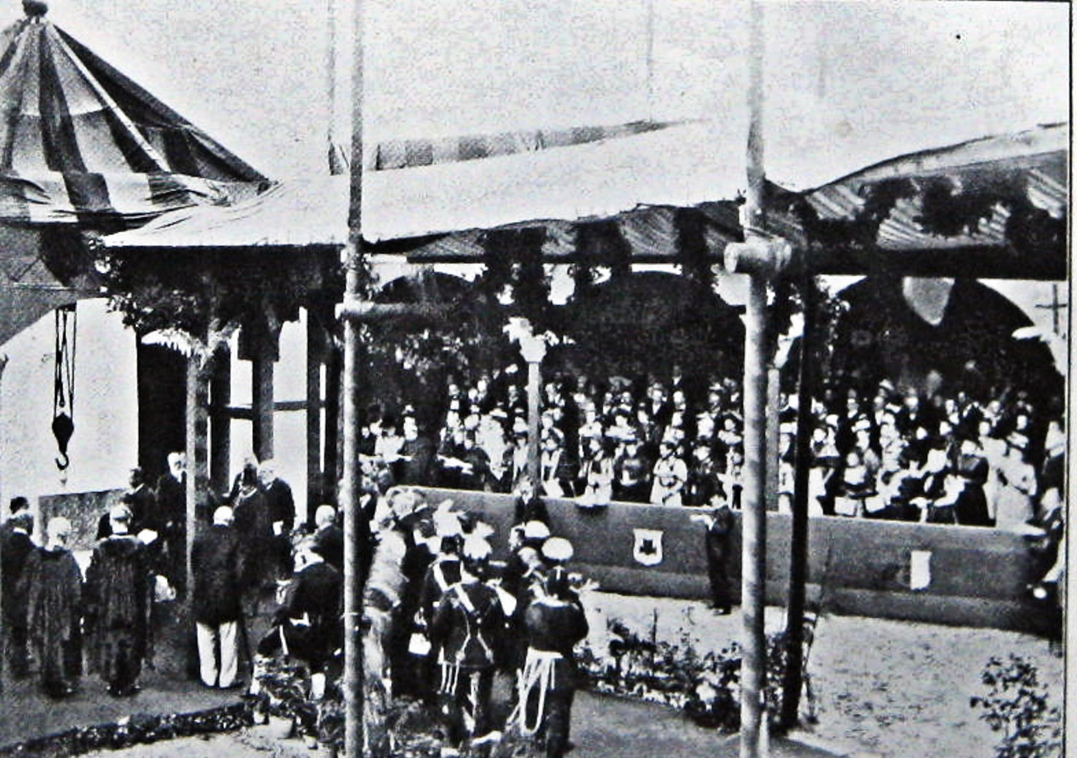 On the Prince’s arrival a Royal Salute was fired from the Drop Redoubt, on the Western Heights and accompanied by the Marquis, the Prince, in the State carriage led a procession of 37 horse drawn carriages to the already laid approach of the proposed Pier. There a tented awning had been erected and a crimson carpet laid. On each side of the carpet, leading to the entrance of the awning, was a guard of honour composing of the Cinque Ports Artillery Volunteers and room for 1,500 spectators, 850 of which had seats. Inside the awning was the foundation stone and seating for the accompanying dignitaries.