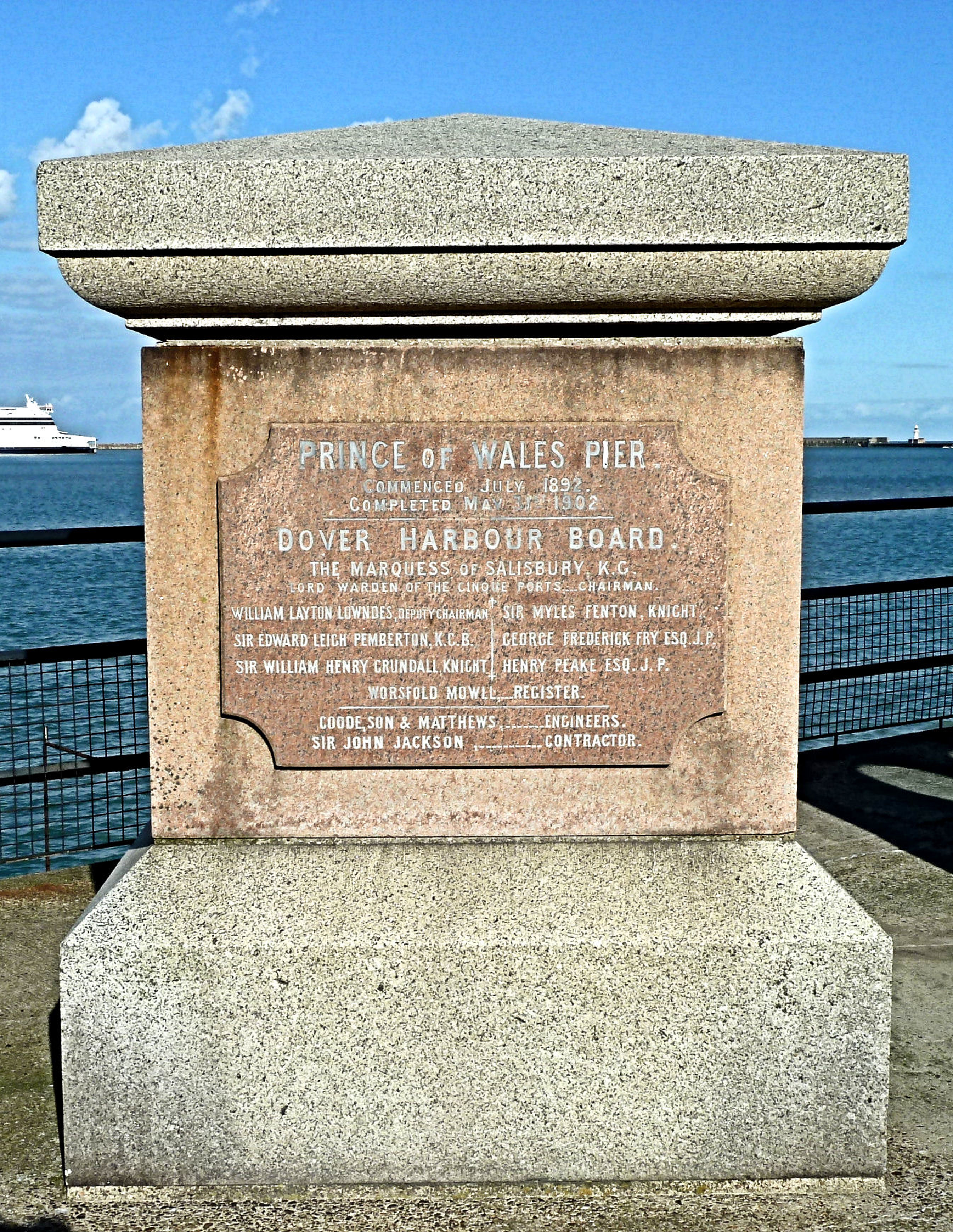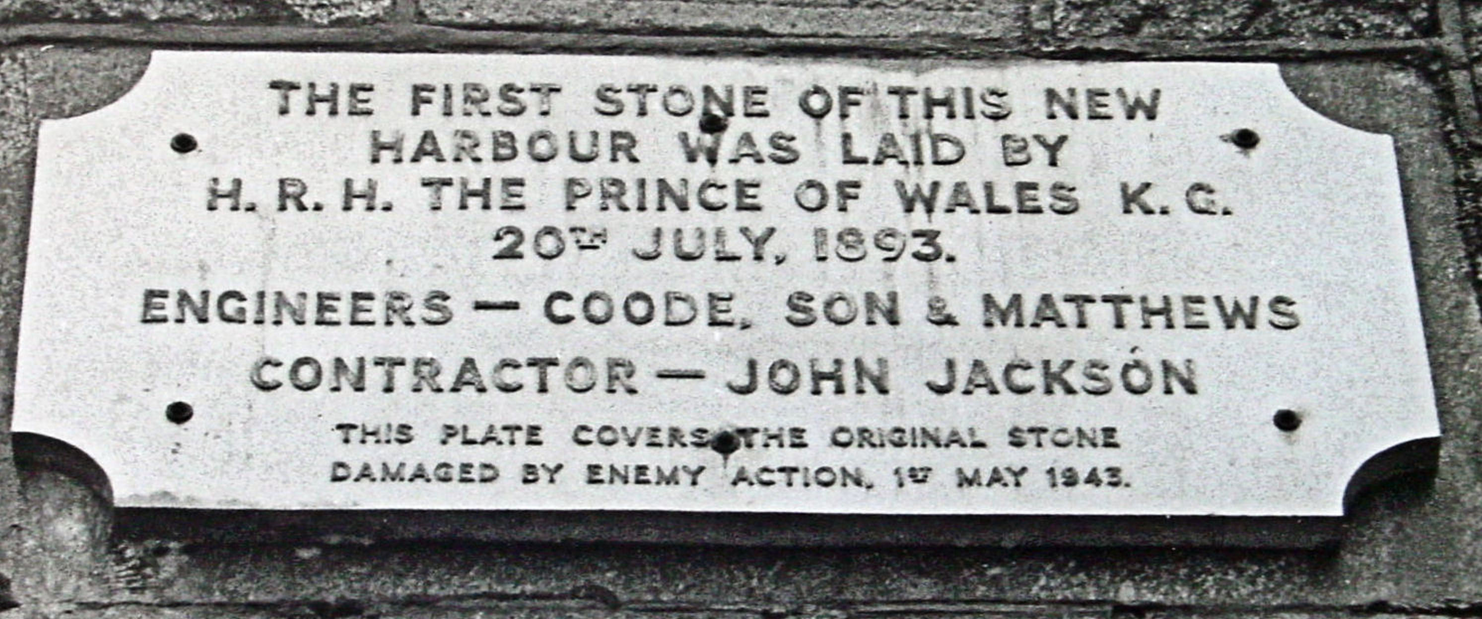 ‘The first stone of this new harbour was laid by H.R.H. the Prince of Wales, K.G. 20th July, 1893. Engineers Coode, Son and Matthews; contractor, John Jackson.’ The present plaque was put in place in 1954 following World War II and reads: ‘The first stone of this new harbour was laid by H.R.H The Prince of Wales K.G. 20 July 1893 Engineers Coode, Son & Matthews. Contractor John Jackson. This plate covers the original stone damaged by enemy action 1 May 1943.’