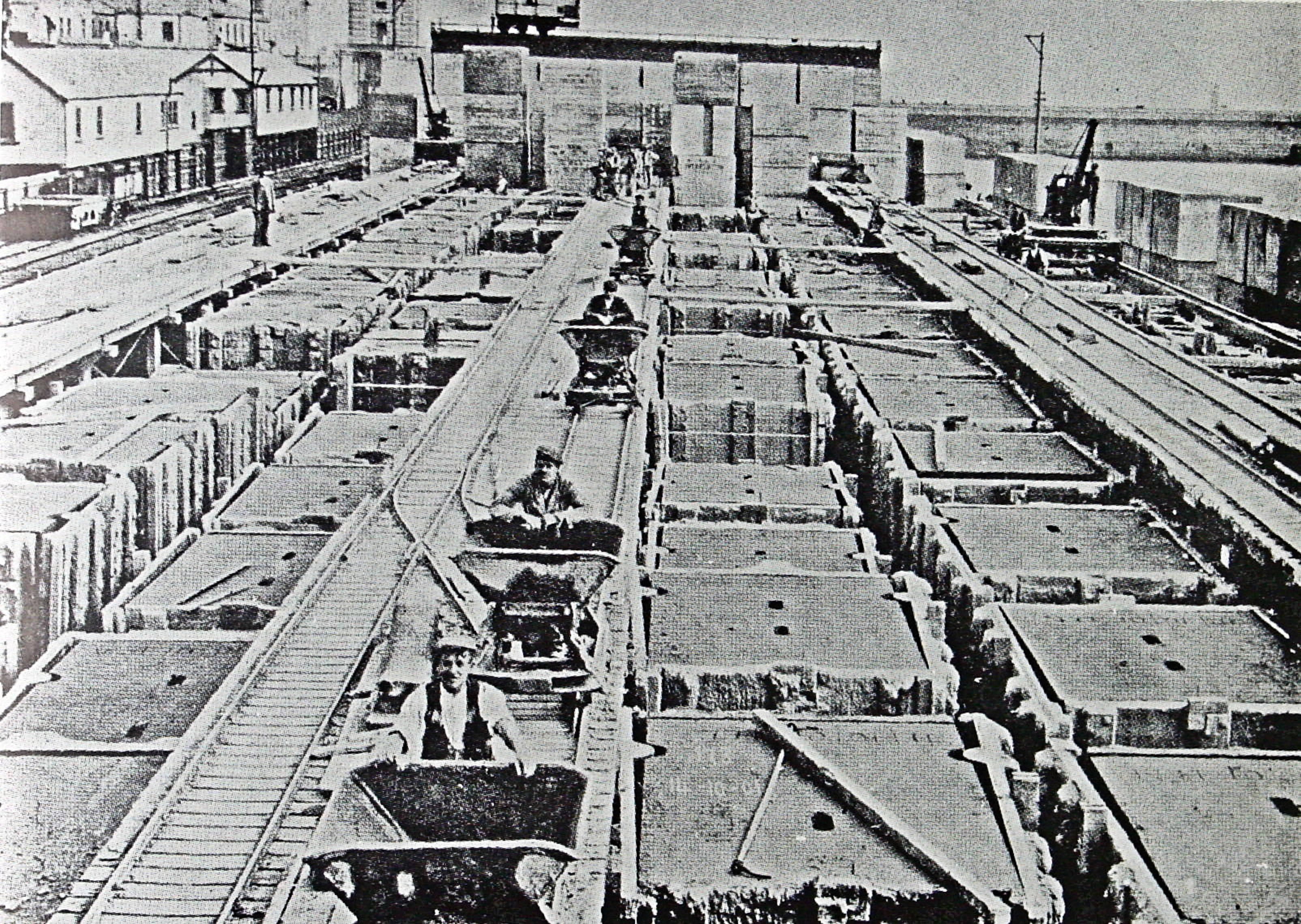 Block making for Admiralty Pier – Concrete poured into wood moulds that opened at each side when set. Courtesy of DHB