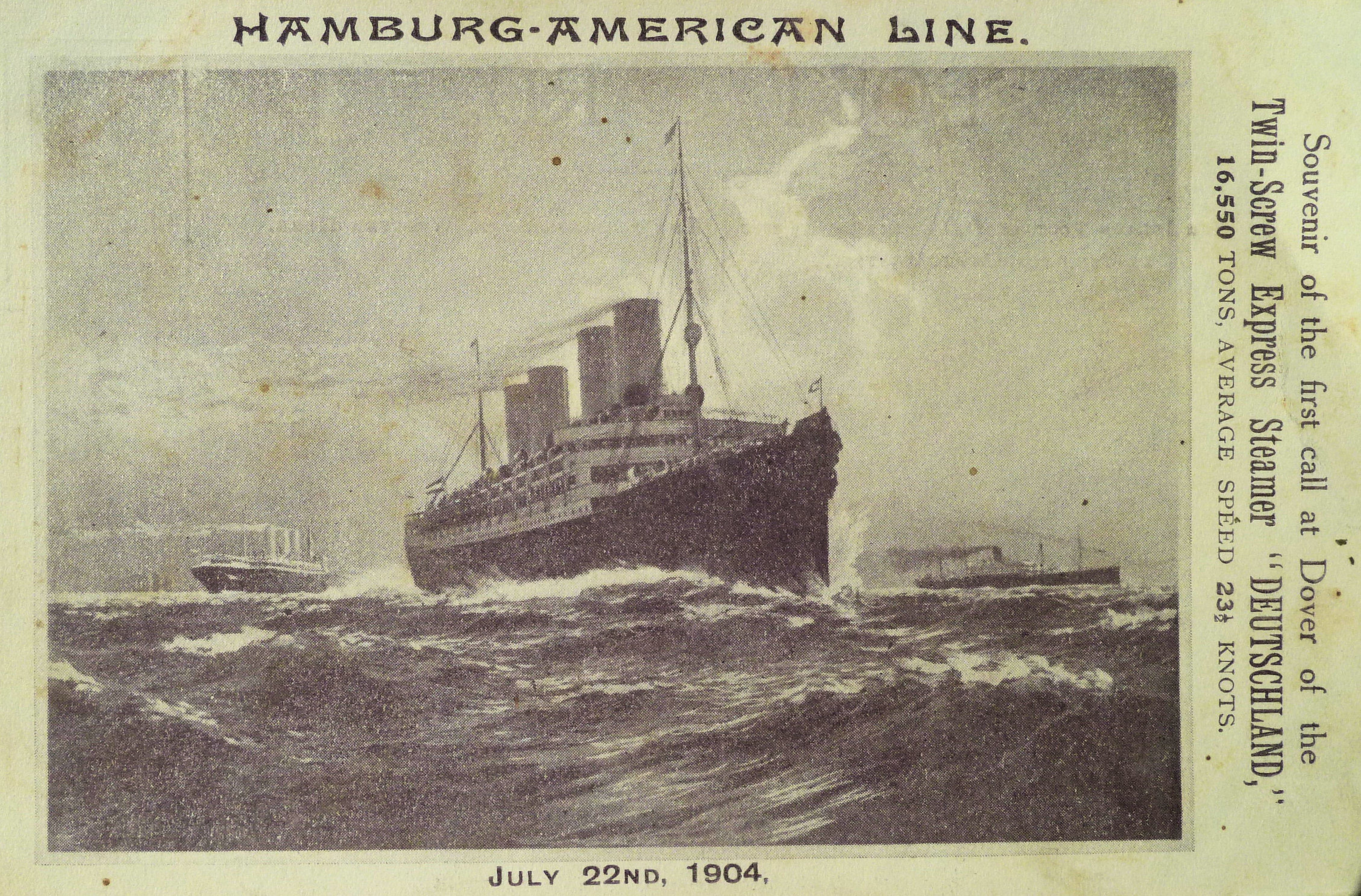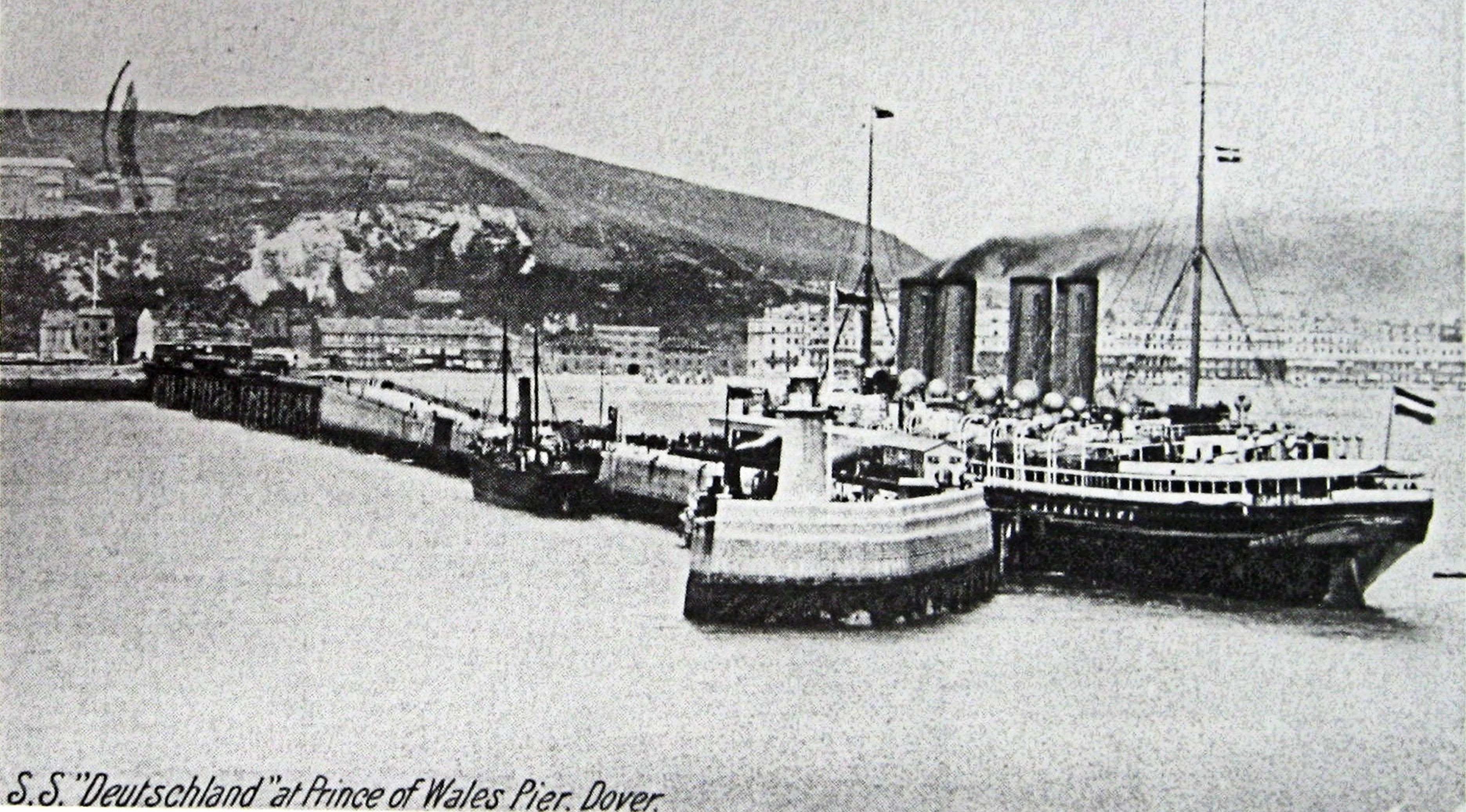 However, the liners brought with them problems not previously considered. A seaman’s strike at Hamburg meant that the 8,332 ton Fürst Bismark, built in 1905 by Fairfield Shipbuilding and Engineering Company, Glasgow, left Hamburg with only half her compliment of crew. Bound for Mexico and Cuba, she picked up more crew en route for Dover where seamen had been recruited from London and Liverpool docks. On arrival at the Prince of Wales Pier, the British contingency realised that they were effectively strike breaking and rejoined the train that had brought them, putting their kit bags in the luggage van. Crew members of the Fürst Bismark took the kit bags off the train and on board the ship and trouble broke out. Although Dover spectators were in sympathy with the seamen, the officials were not and the police were called. Eventually, the men reluctantly went on board. However, as the ship was about to sail two British men climbed down the bow ropes onto the Pier and absconded. The next day the Deutschland, arrived with her full compliment of crew.