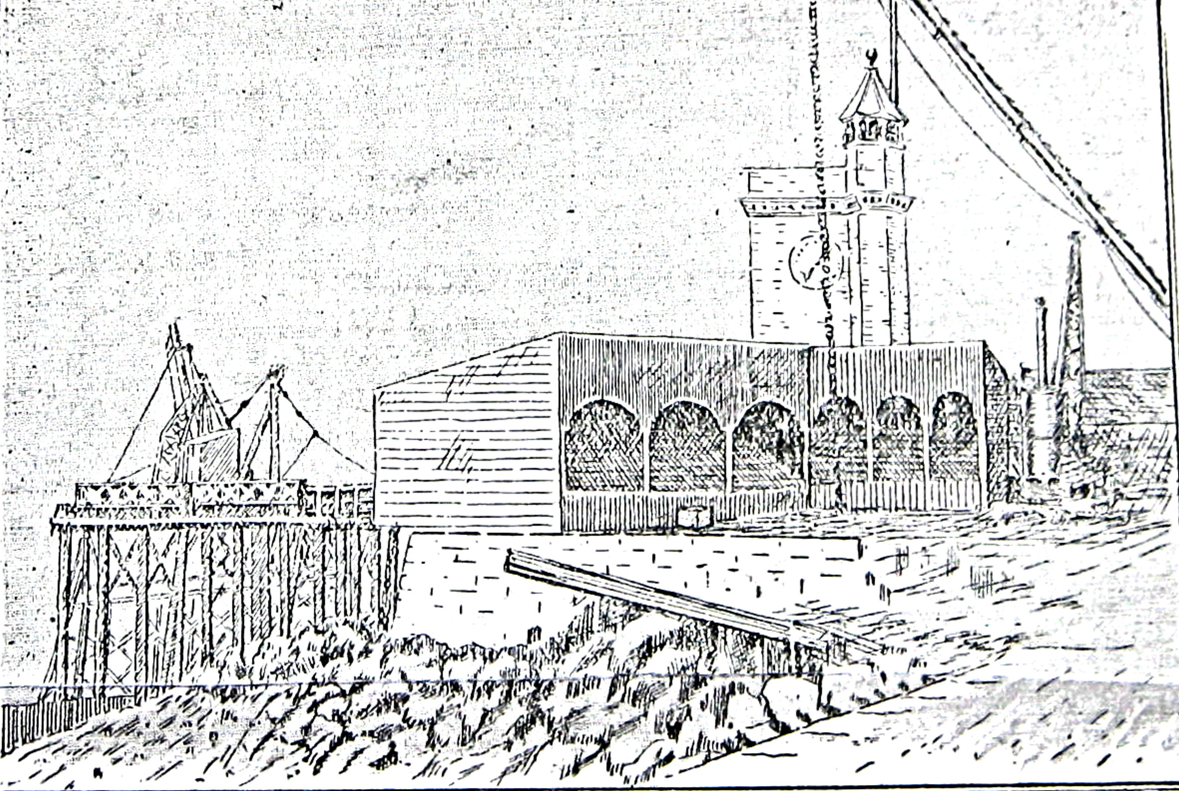 It was not long after the foundation stone was laid before the first major construction problem was encountered. When the first pile was driven in, it sank into the soft seabed without trace! A second one was tried, further out, and this did the same. It was then decided to sink hollow cast-iron cylinders placed 40-feet apart and to then fill them with concrete. Although this worked, it delayed the construction. Nonetheless, by the autumn of 1893, the iron viaduct was progressing well and it was estimated that the poll-tax of one-shilling on all cross channel passengers would raise £16,000 that year. However, there was concern that the Pier was a potential shipping hazard so on 21 September two green lights were fixed to the sea end staging. A cardinal buoy was also placed at the seaward edge of where the staging for the viaduct was expected to reach.