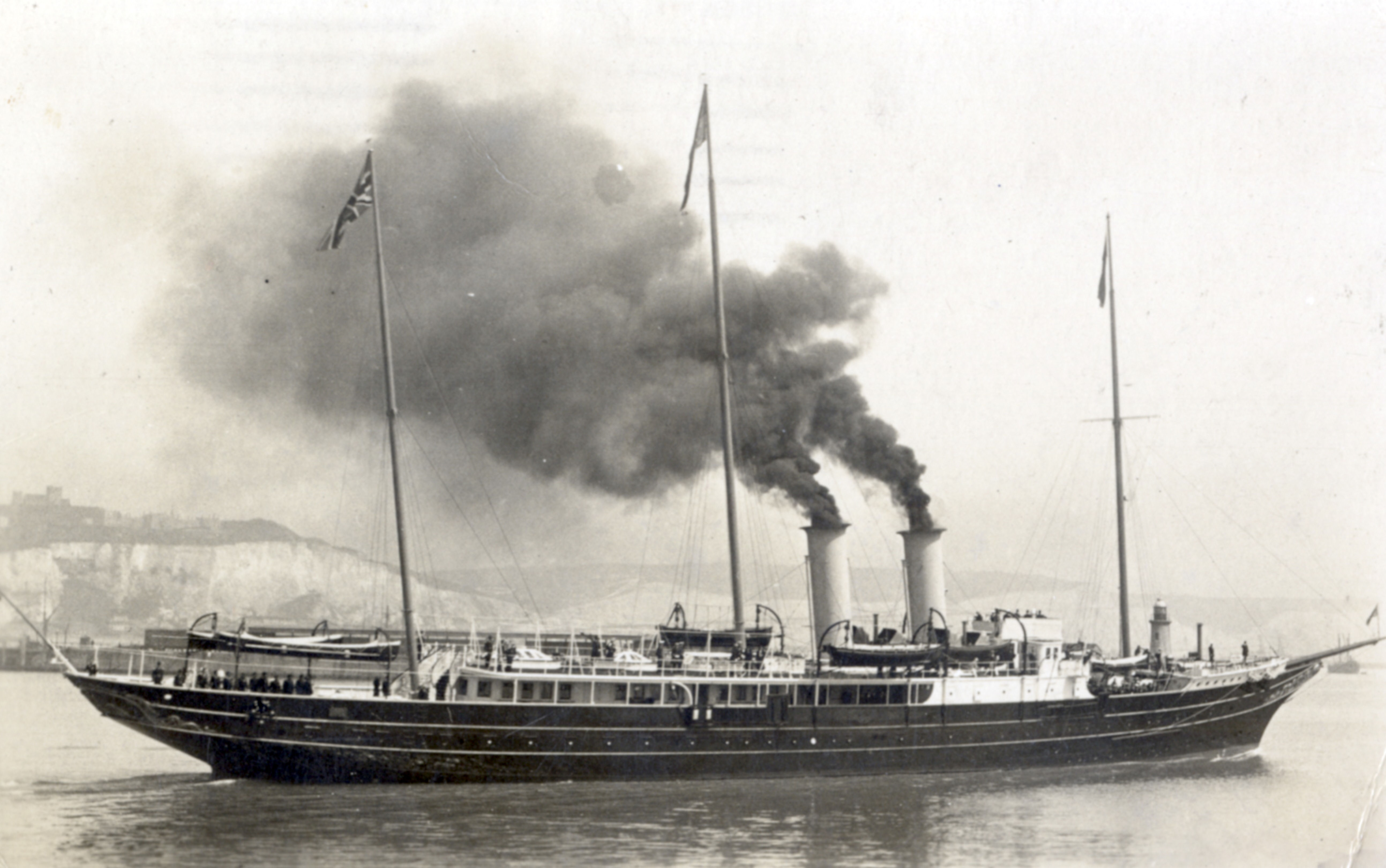 On 15 December 1903, an agreement was signed between DHB, SECR and the Hamburg-Amerika Line for their ocean going cruise ships to call into Dover from 1 July 1904. On the morning of Sunday 13 March 1904 the Kaiser Wilhelm II, who was voyaging to Vigo and Gibraltar, was expected to arrive at the Prince of Wales Pier on the 10,643-ton König Albert steamship belonging to the Norddeutscher Lloyd Line. However, due to thick fog the ship was delayed so the Dover reception party travelled out on a DHB tug to meet the Kaiser in the Channel. The party included Captain John Iron, the Harbour Master, who was photographed talking to Wilhelm II on the Bridge.